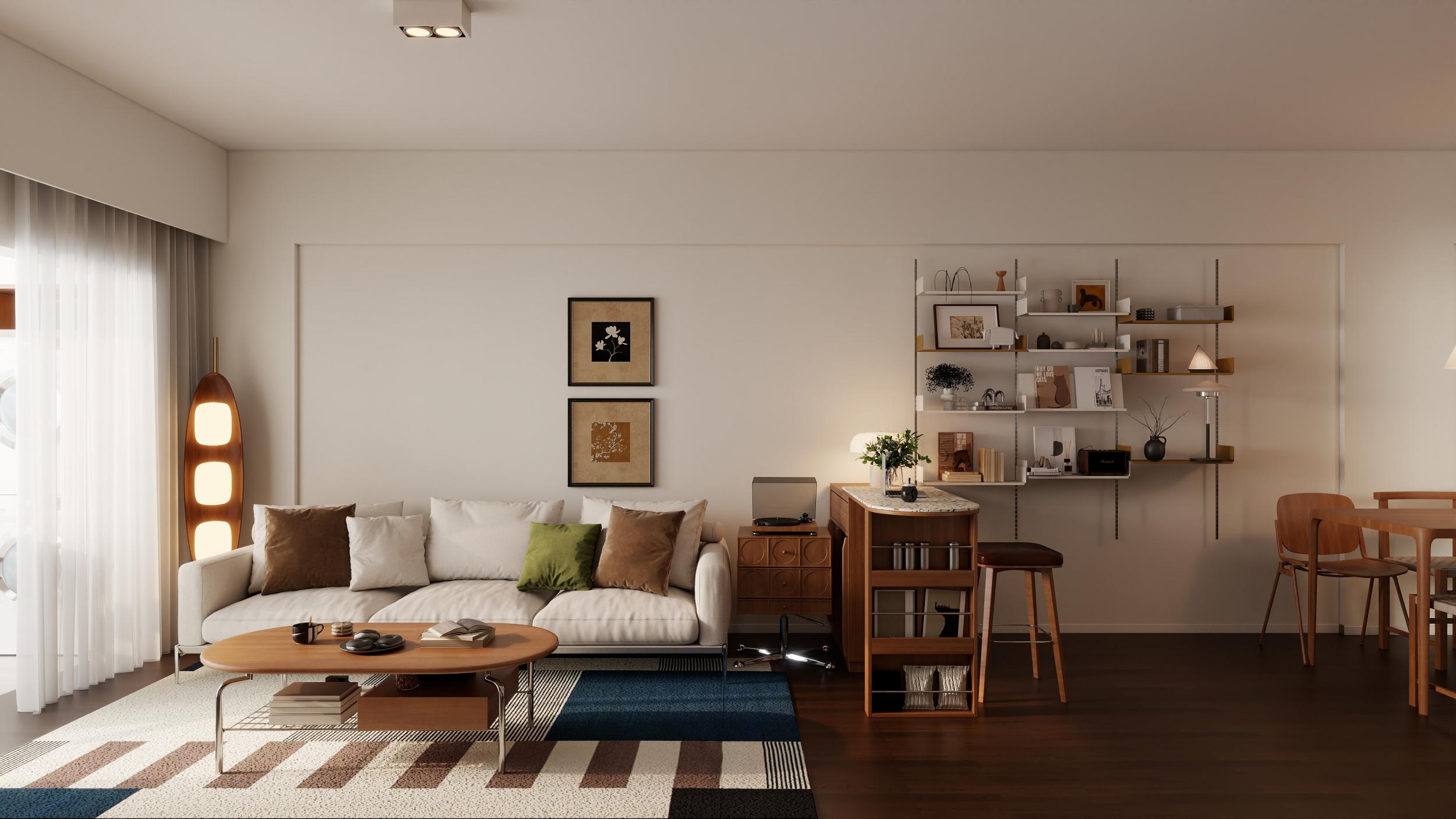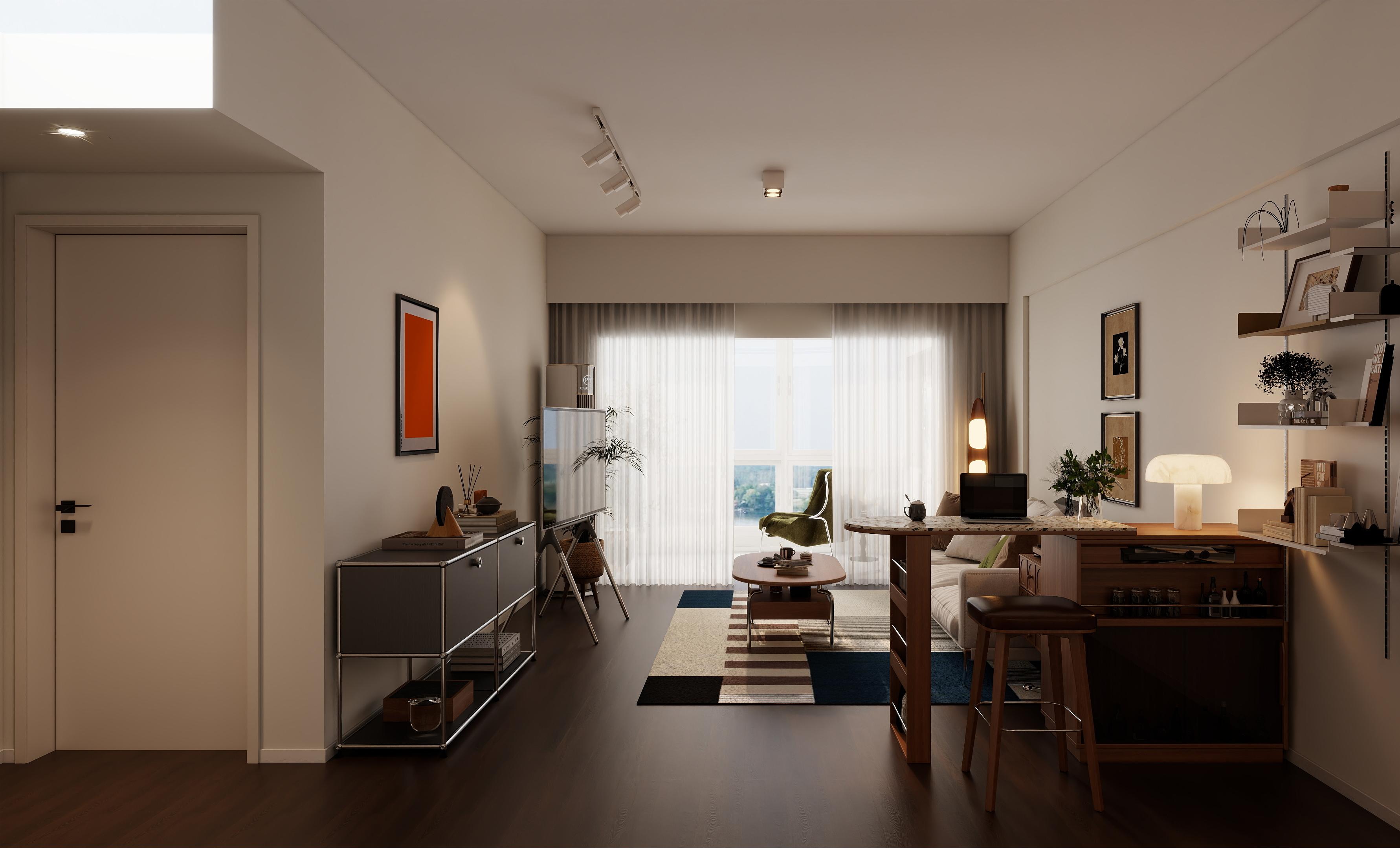 客厅布局开阔,与阳台相连,大窗户搭配轻薄的白色窗帘,保证了充足的自然采光,使空间显得明亮通透。浅米色的沙发搭配多个颜色协调的抱枕,增添了舒适感和层次感。木质茶几简约自然,与地板材质相呼应。墙上挂有装饰画,为空间增添了艺术氛围。一旁的木质边柜兼具收纳与展示功能,上面摆放的绿植和装饰品,为客厅带来了生机与活力。采用无主灯设计,轨道射灯和筒灯提供了充足的照明,同时营造出温馨的氛围。角落的落地灯在夜晚提供局部照明,增加了空间的温馨感。