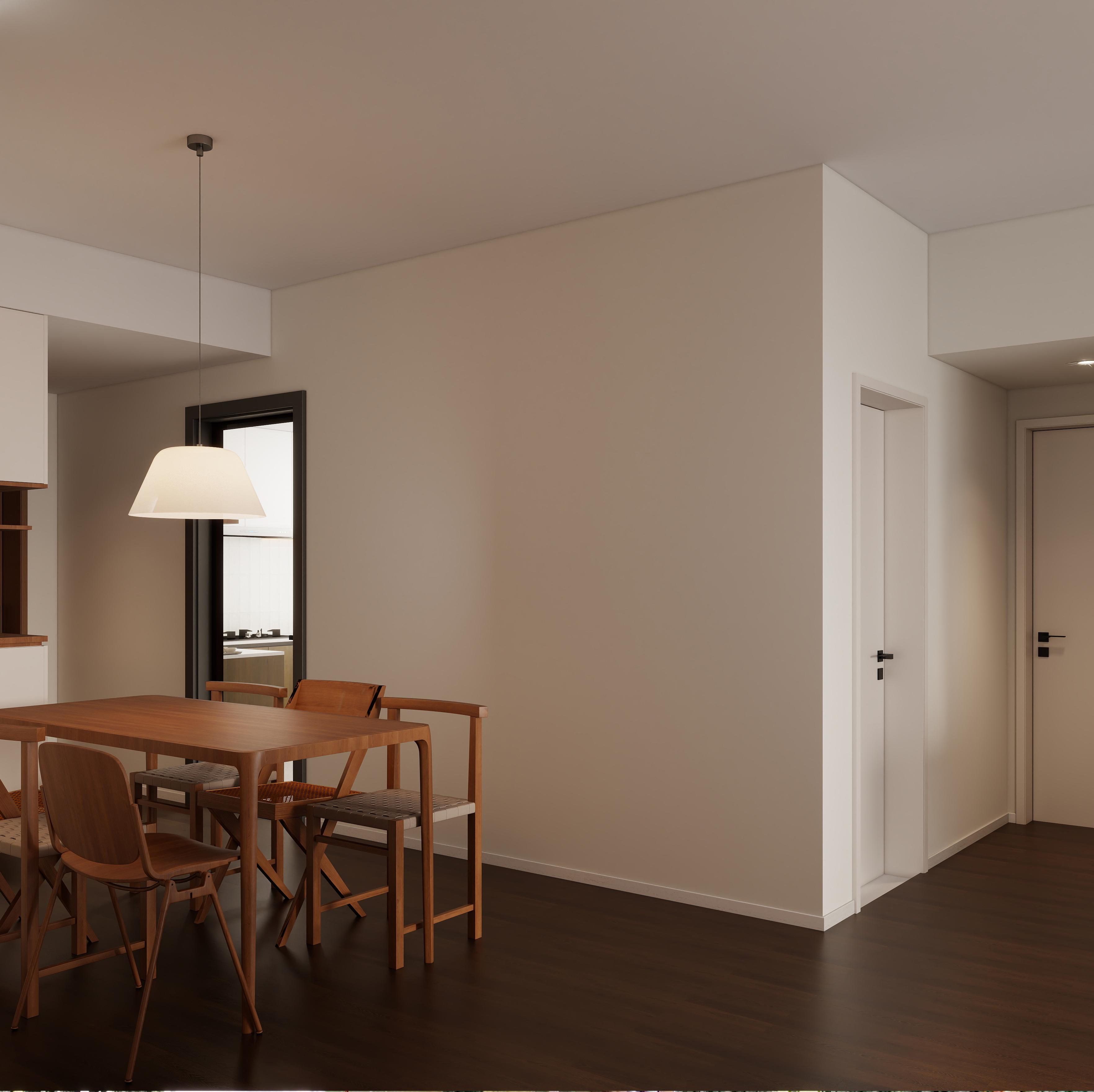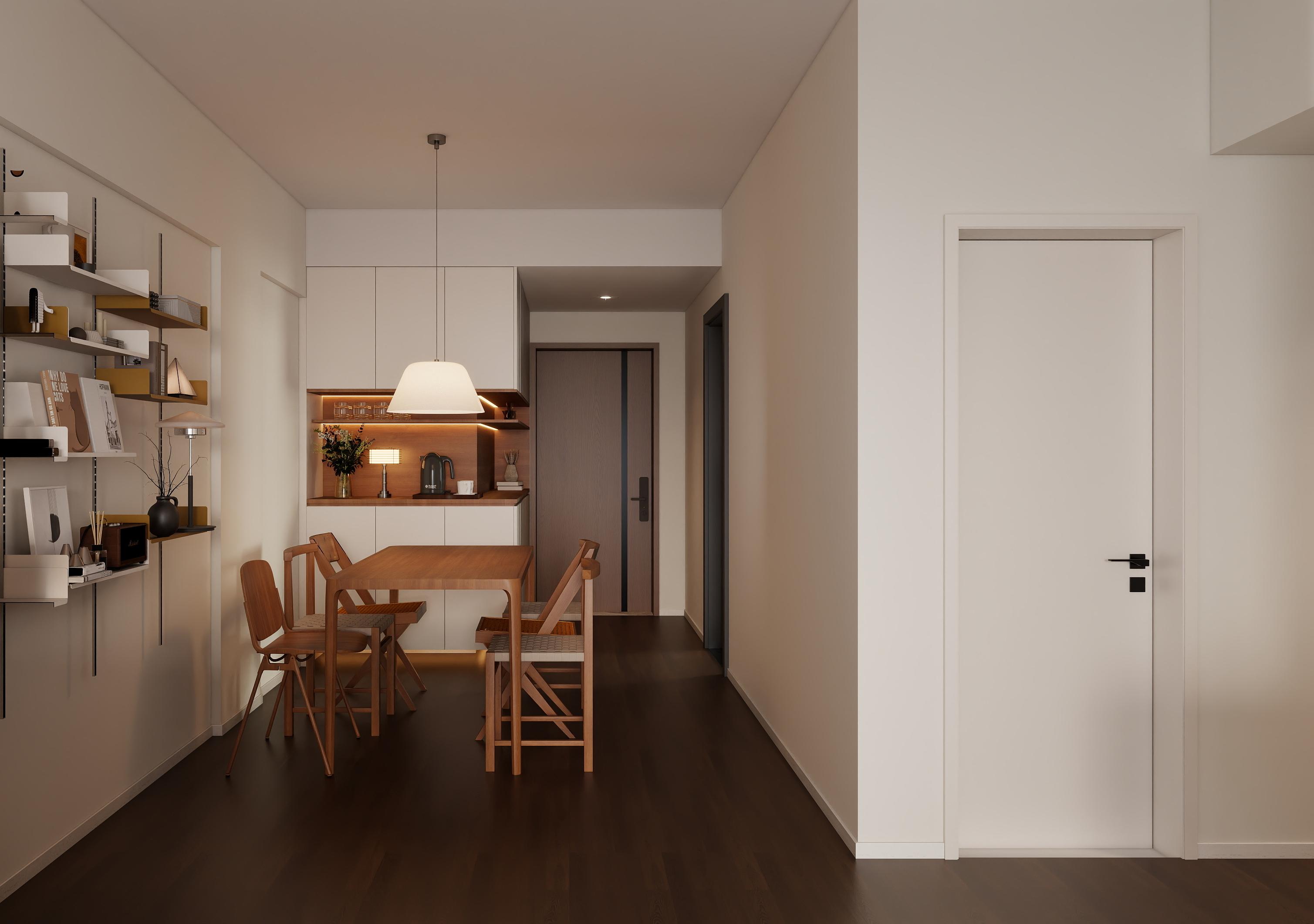 餐厅与客厅相连,形成开放式的空间布局,增强了空间的互动性和通透感。木质餐桌搭配同材质的餐椅,风格统一,自然质朴。餐桌上方悬挂的白色吊灯,造型简约,为用餐区域提供了集中的照明。一侧的餐边柜设计巧妙,既有封闭的储物空间,用于存放餐具和杂物,保持空间整洁;又有开放的展示架,摆放着各种装饰品、书籍和绿植,增加了空间的层次感和生活气息。