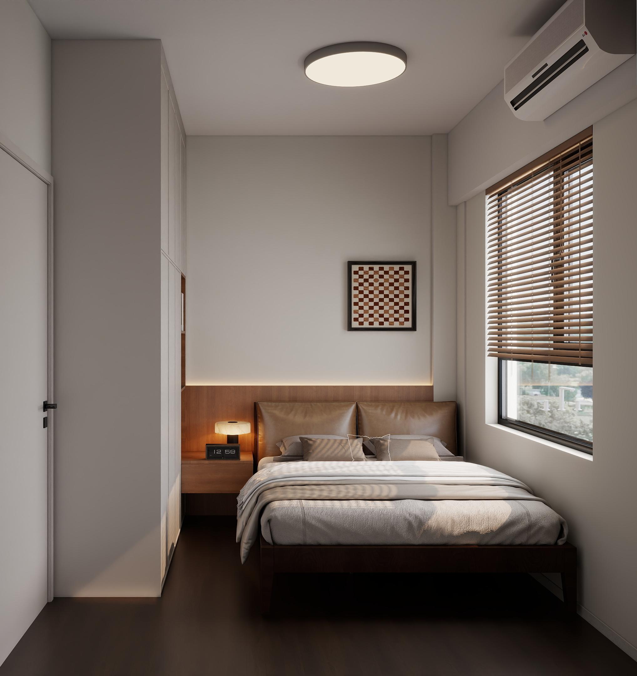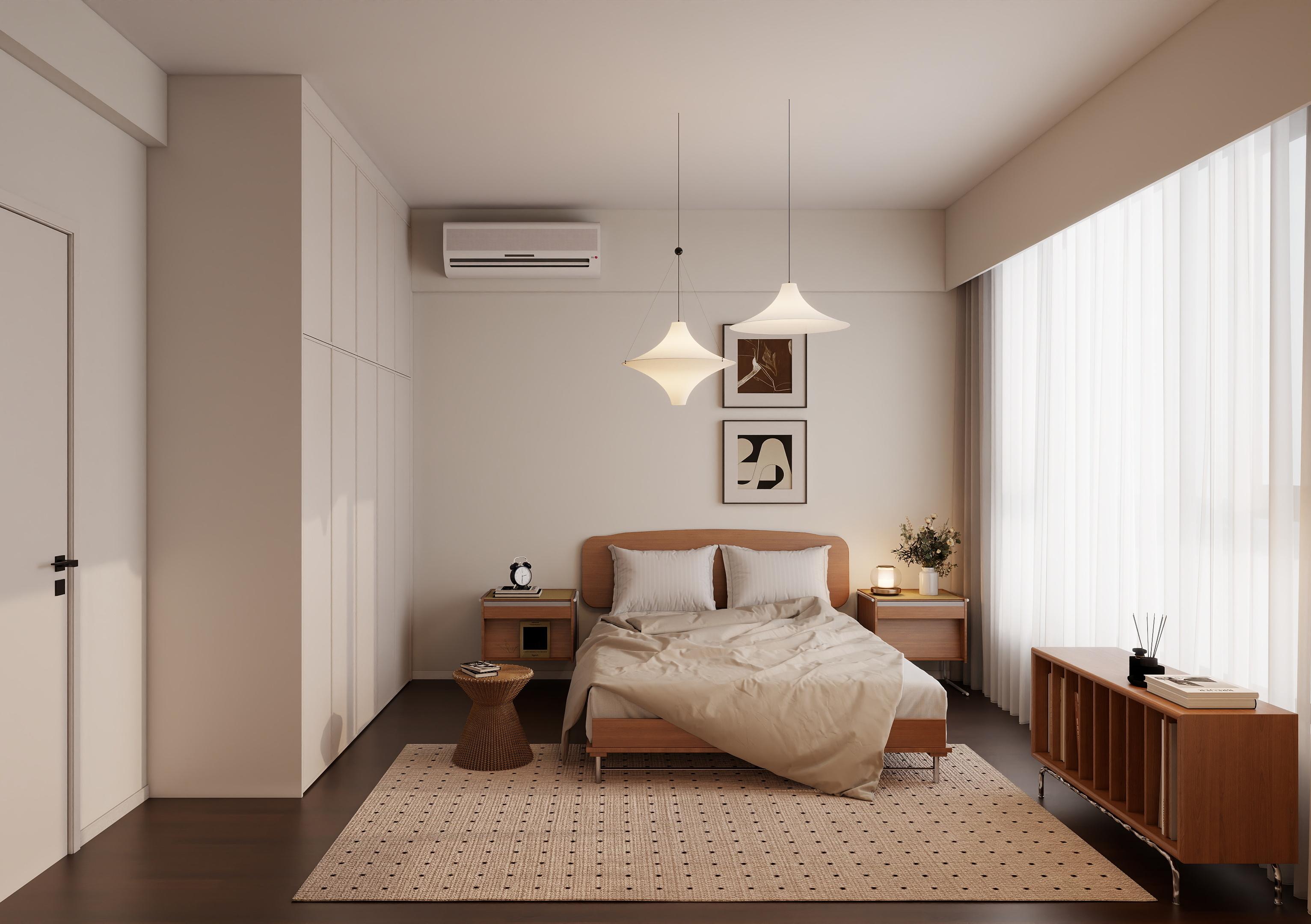 卧室延续了整体的简约风格,色调柔和,营造出宁静、舒适的睡眠环境。床品选择浅色系,搭配木质床架,显得温馨自然。床头两侧的床头柜,方便放置日常用品。部分卧室设有书桌和椅子,满足工作或学习的需求。采用柔和的灯光设计,床头灯和吊灯相结合,满足不同的照明需求。墙上的装饰画和绿植点缀,为空间增添了艺术感和生机。