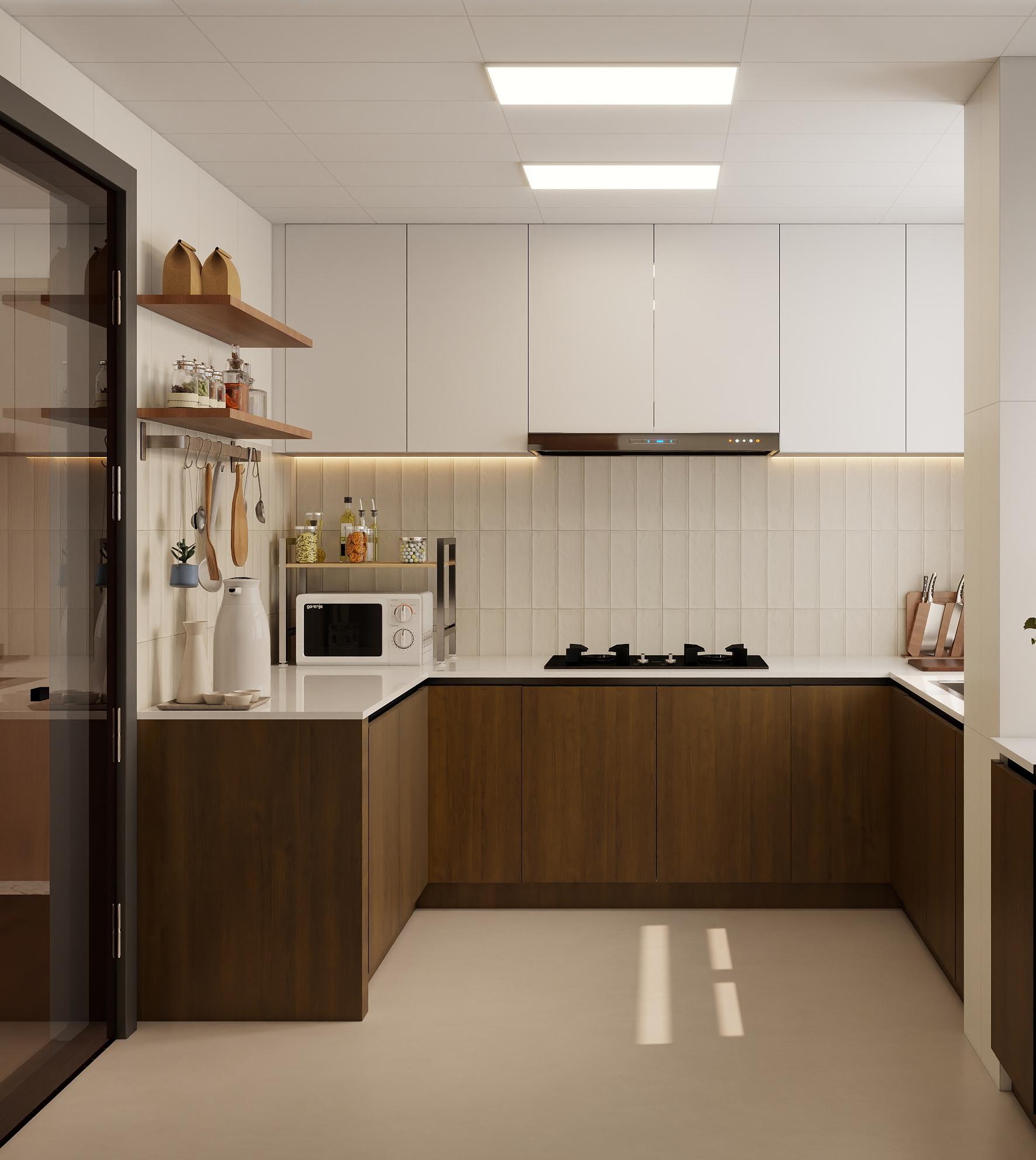 采用L型或U型布局,充分利用空间,操作流程更加顺畅。橱柜以白色和木色为主,简洁明亮。墙面铺设浅色瓷砖,易于清洁。台面选择耐用的材质,满足日常使用需求。配备现代化的厨房电器,如微波炉、抽油烟机等。橱柜内部设计合理的收纳分区,方便存放厨具和食材。