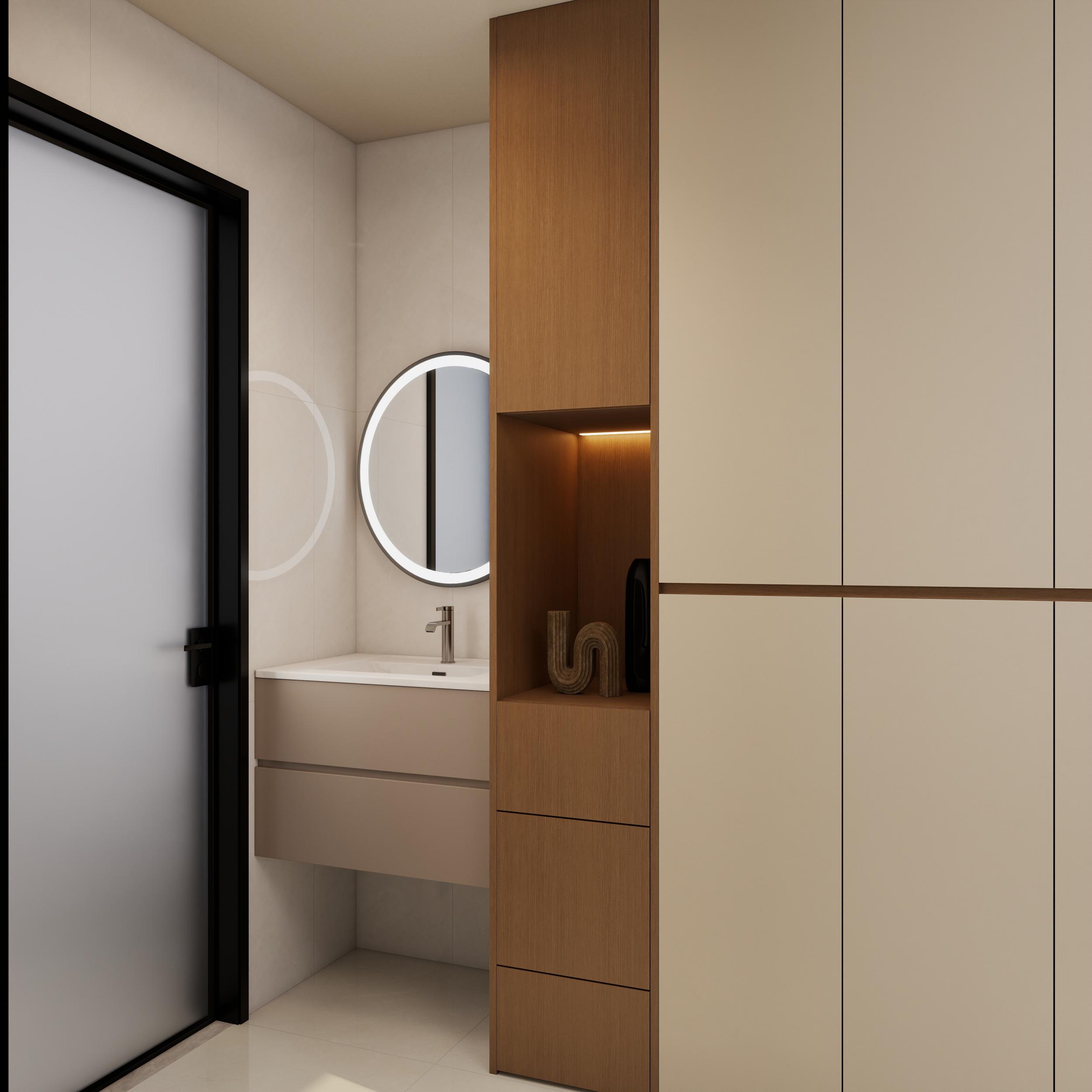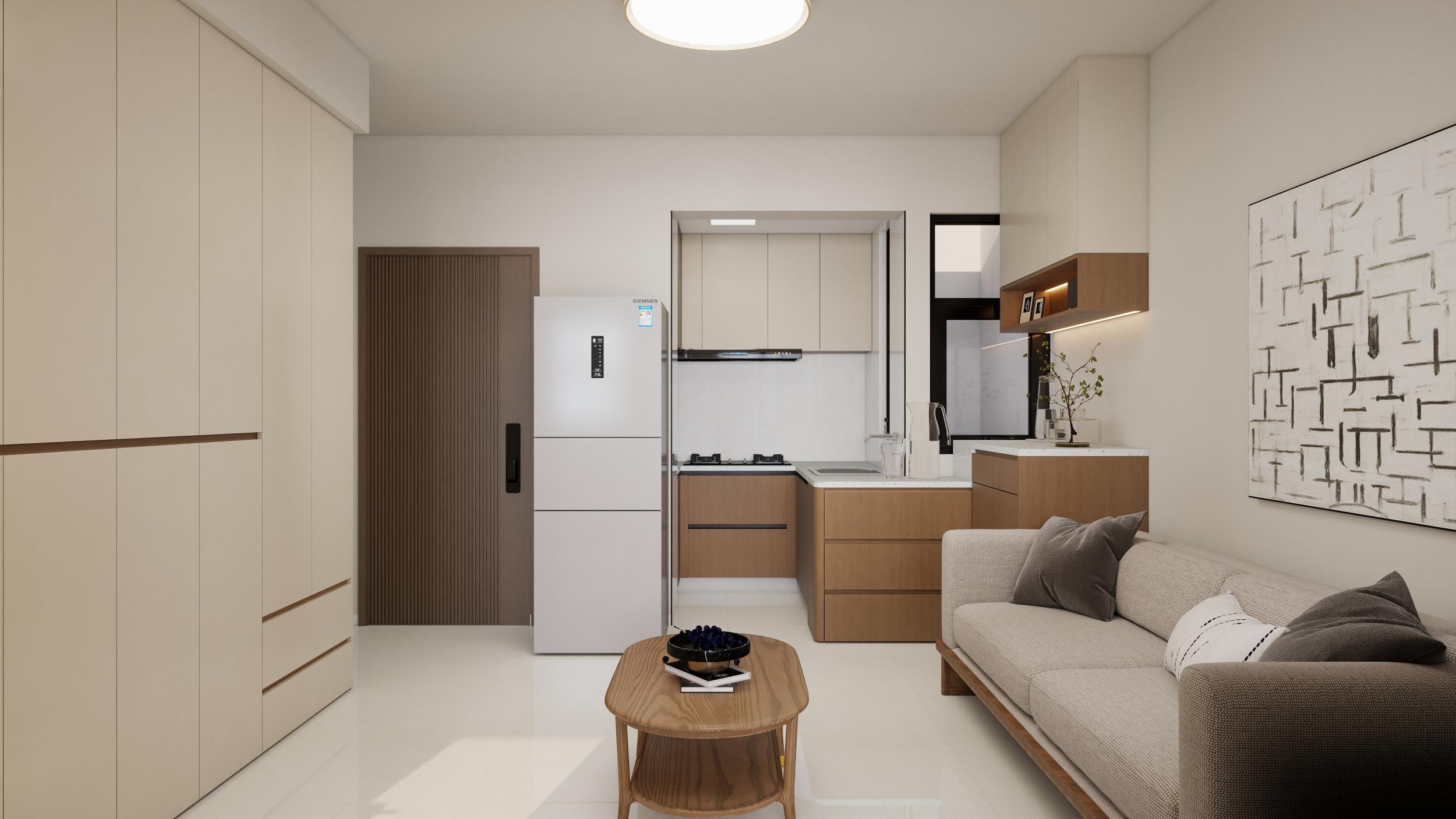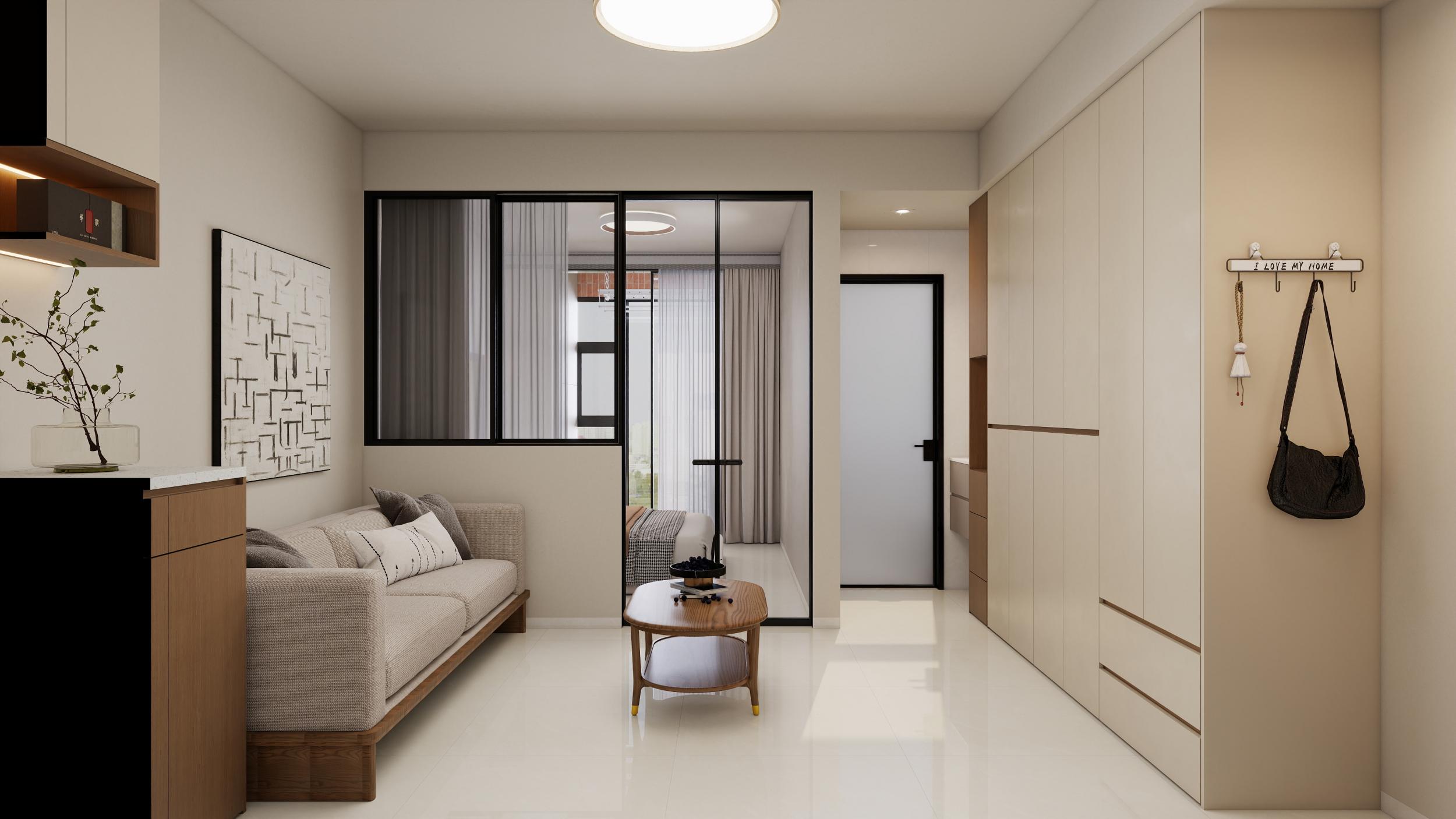 客餐厅:现代简约原木奶油风,奶白墙面搭配原木家具,黑框玻璃门分隔空间,灯光柔和,整体通透温馨又显质感。 卧室:主打静谧奶油风,奶白墙面搭配原木床头柜,软包床头舒适温馨,双层纱帘兼顾采光与隐私,氛围放松。 卫生间:简约奶油风设计,干湿分离更实用。干区奶白柜体搭配圆形镜,湿区通铺奶白瓷砖,黑框门提升精致度,整洁利落。