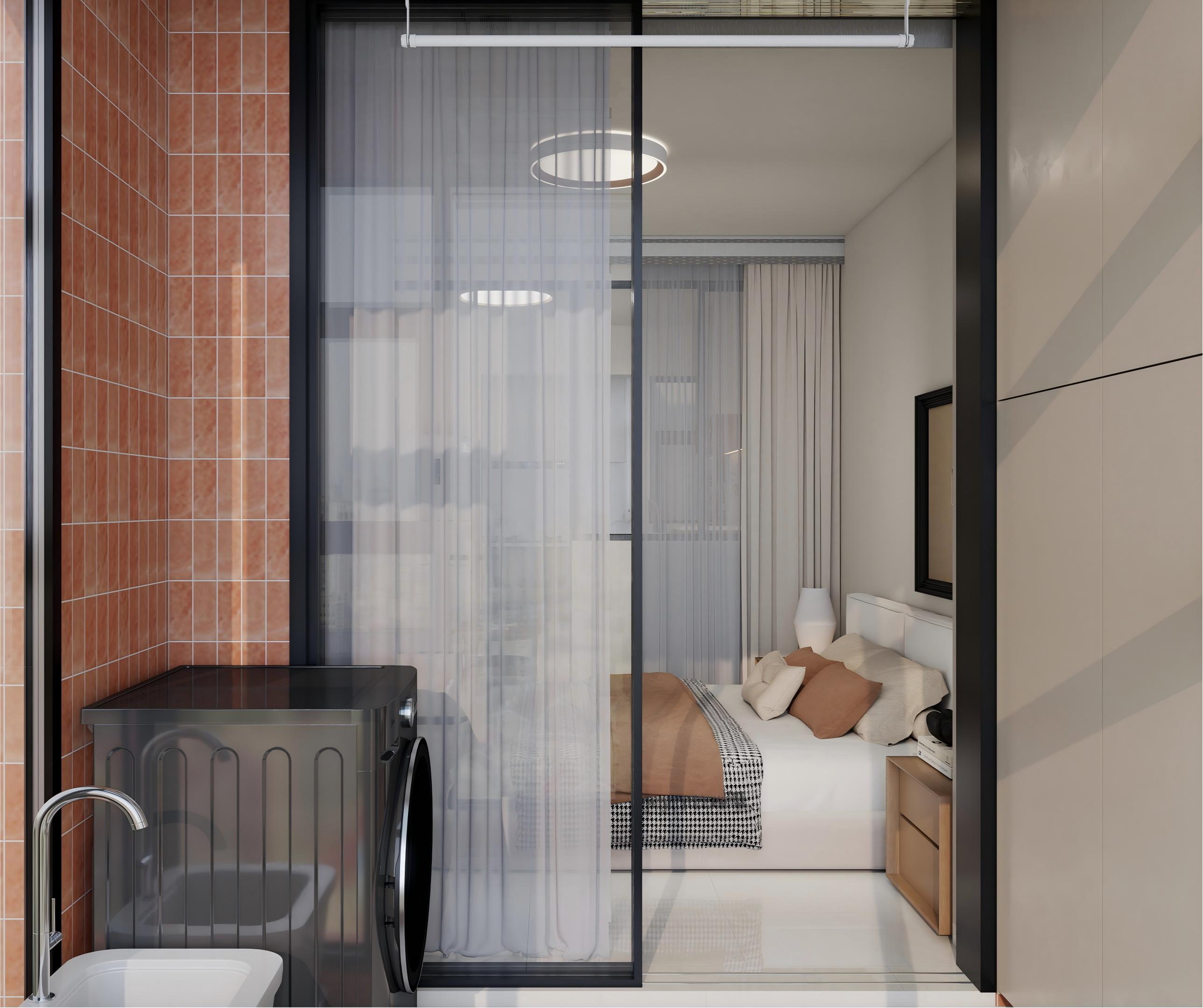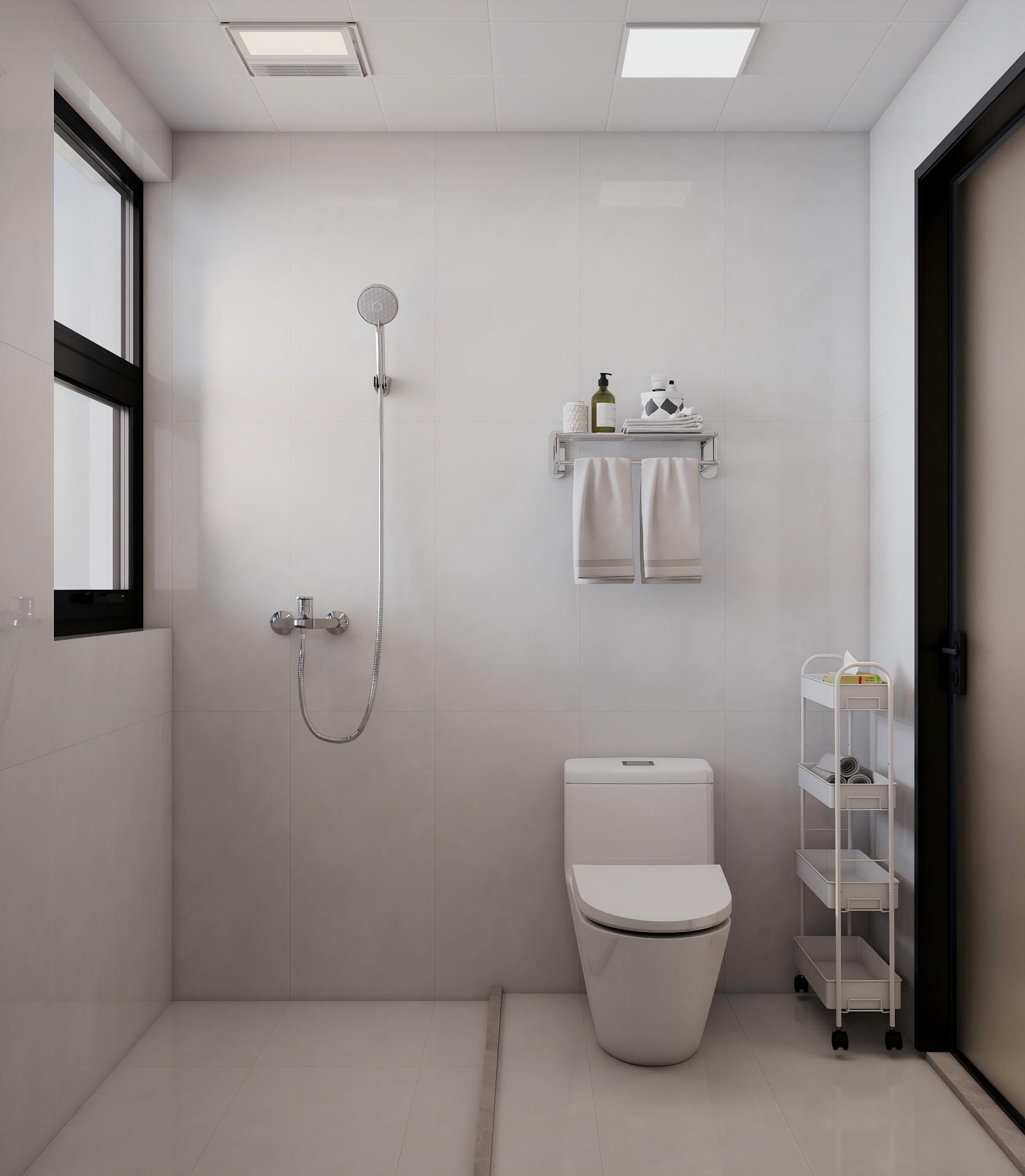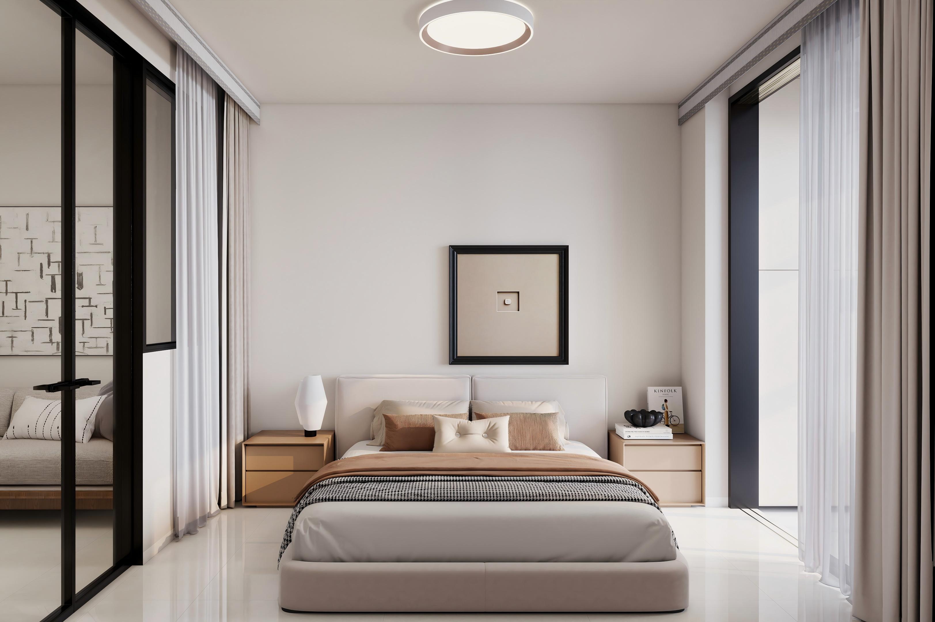客餐厅:现代简约原木奶油风,奶白墙面搭配原木家具,黑框玻璃门分隔空间,灯光柔和,整体通透温馨又显质感。 卧室:主打静谧奶油风,奶白墙面搭配原木床头柜,软包床头舒适温馨,双层纱帘兼顾采光与隐私,氛围放松。 卫生间:简约奶油风设计,干湿分离更实用。干区奶白柜体搭配圆形镜,湿区通铺奶白瓷砖,黑框门提升精致度,整洁利落。