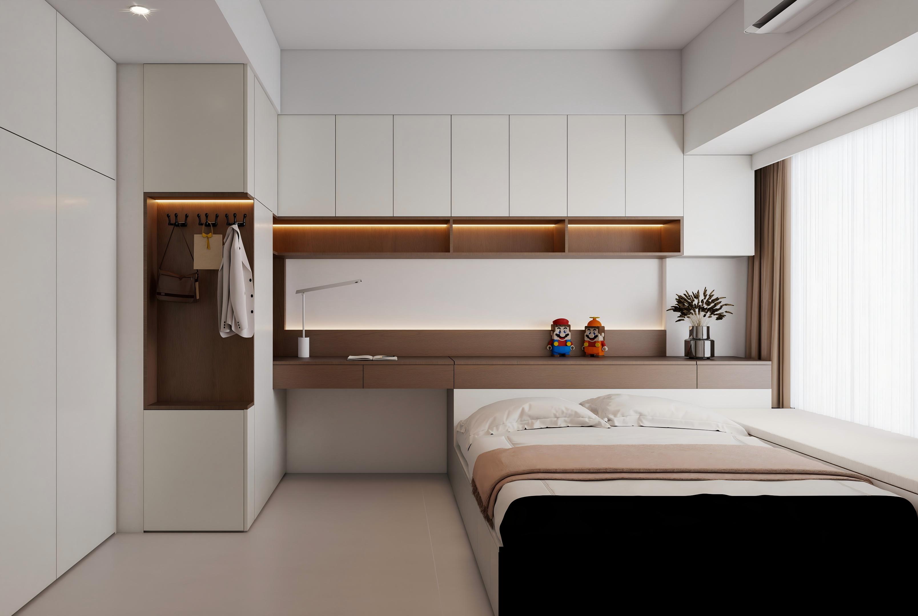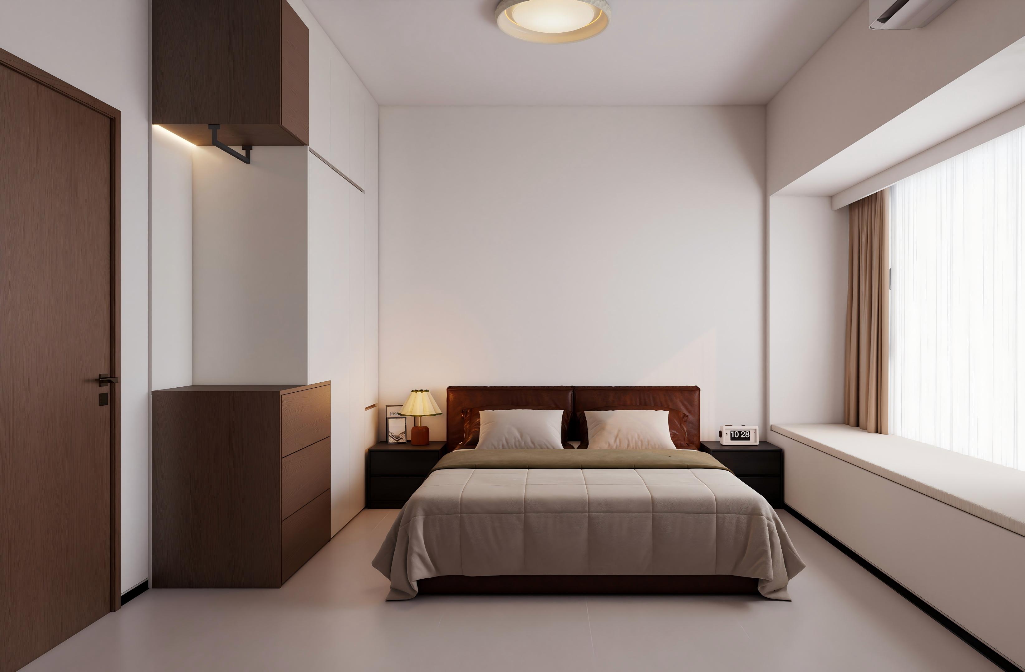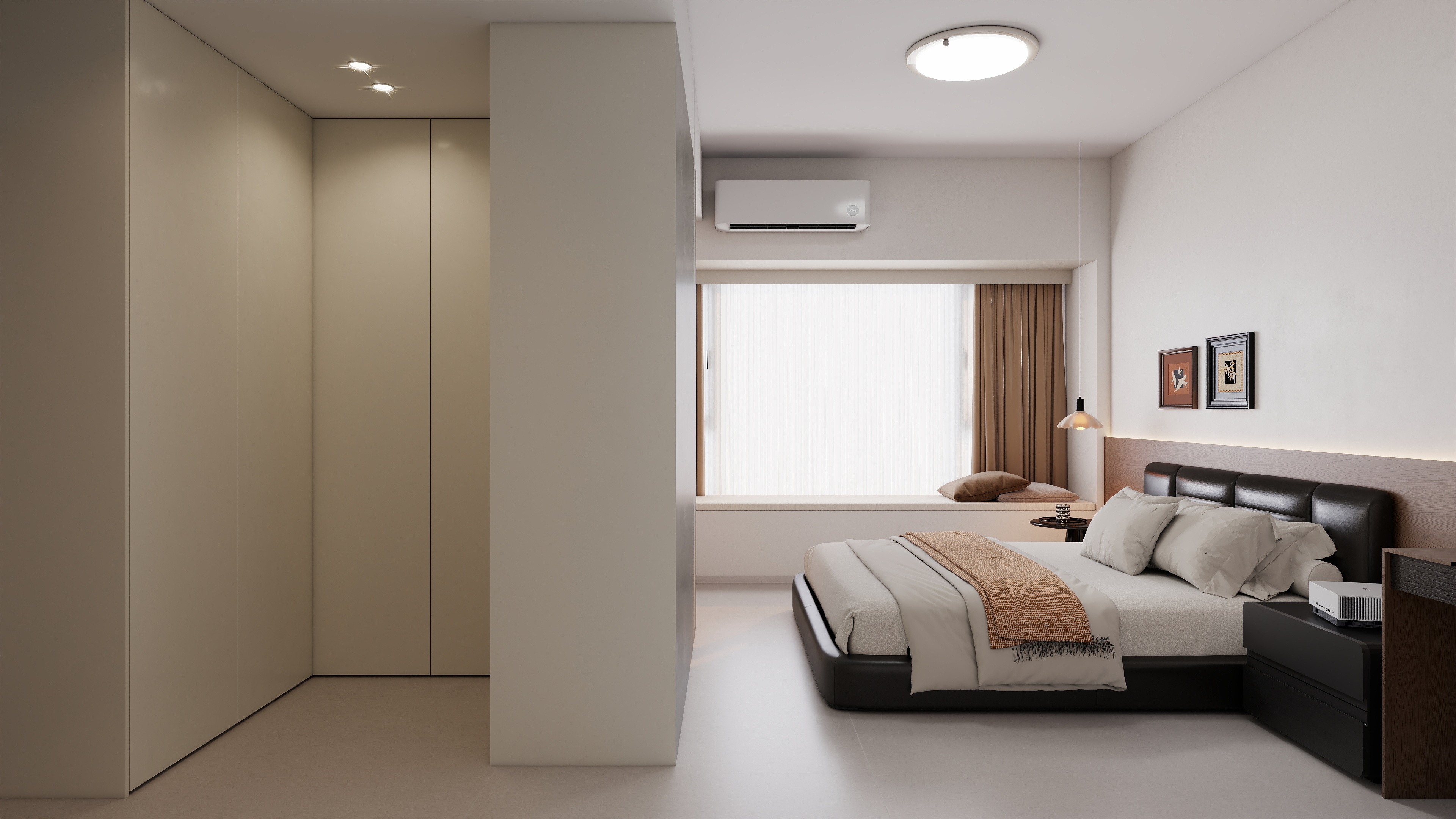 卧室:以奶白、浅咖、黑棕为基调,通顶无拉手衣柜 + 悬浮梳妆台,搭配线性氛围灯、皮质软包床,储物与颜值兼顾,温馨松弛又通透。
