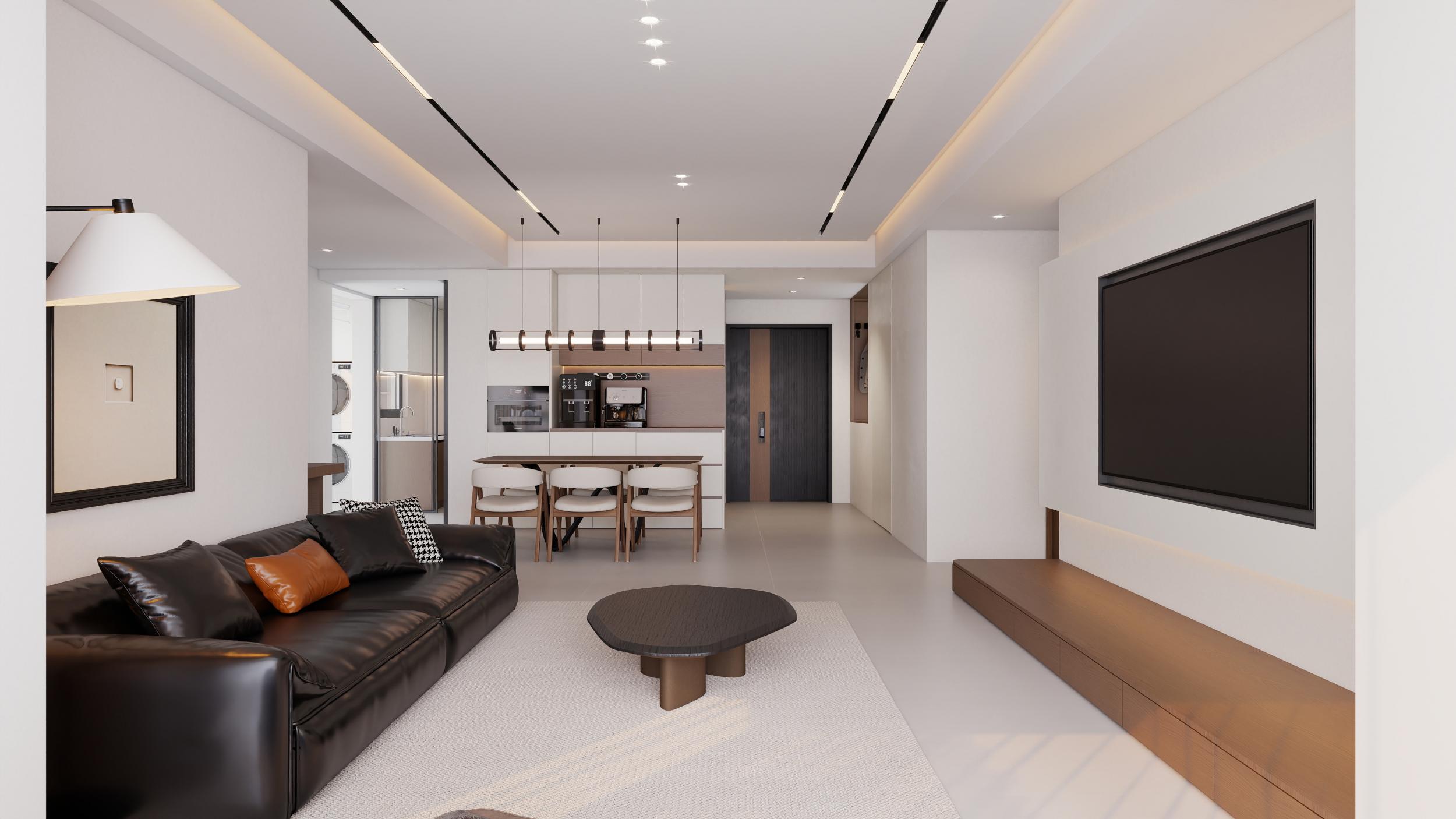 客厅:黑白棕经典配色,黑色真皮沙发 + 悬浮整墙电视柜,无主灯 + 线性灯设计,大落地窗引光,线条利落,空间开阔高级。