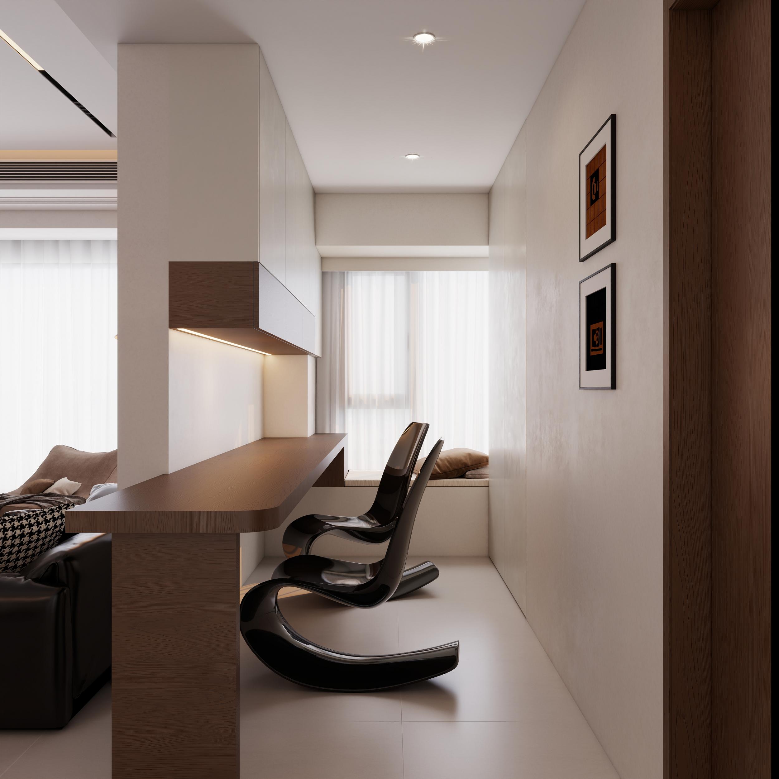 开放式书房:悬浮实木书桌 + 异形休闲椅,开放式布局联动客餐厅,通透不压抑,兼顾办公与休闲,细节呼应全屋风格。