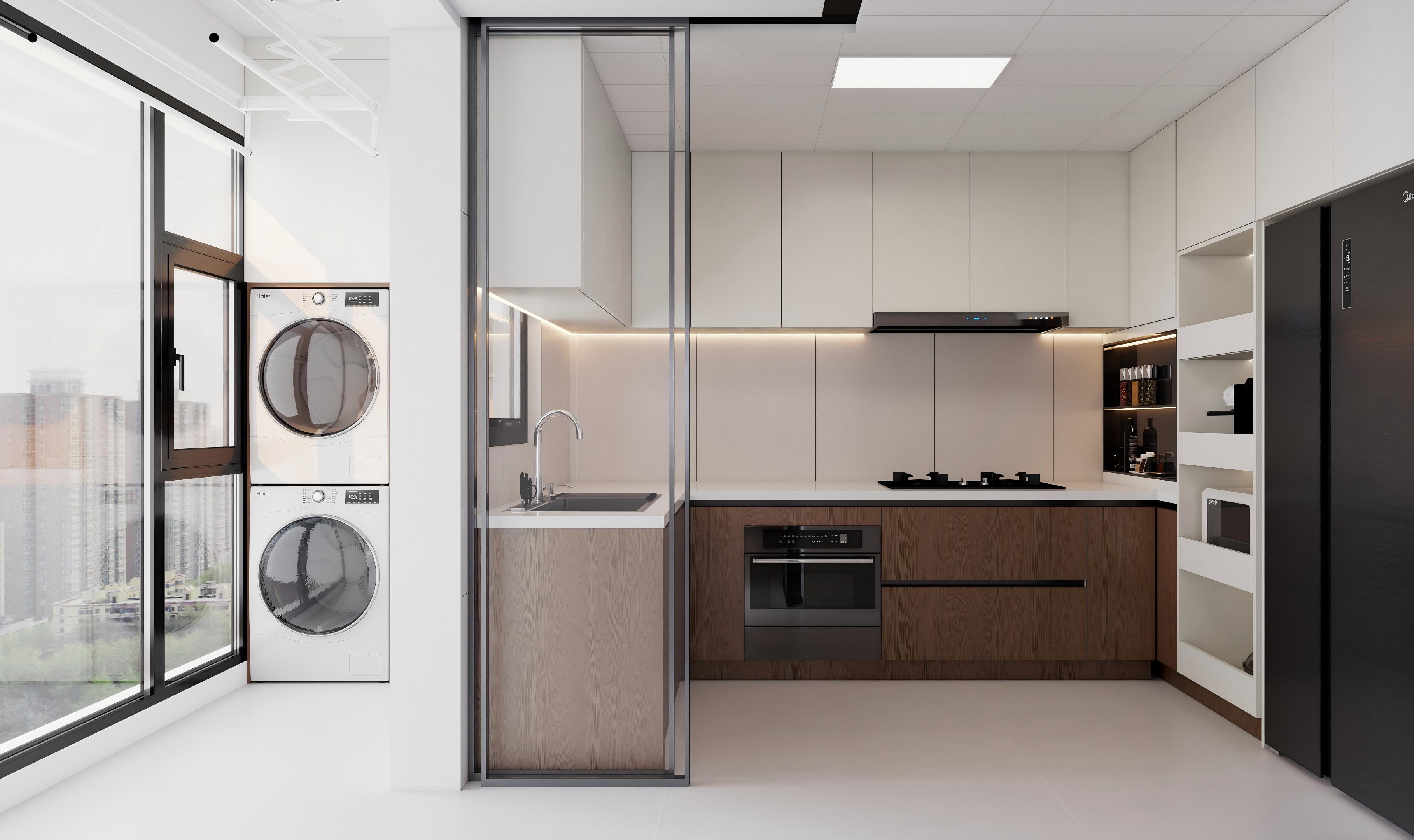 厨房:奶白与深棕撞色,无拉手柜体 + 线性灯,玻璃隔断开敞通透,L 型布局实用,整合洗烘区,高级又整洁。