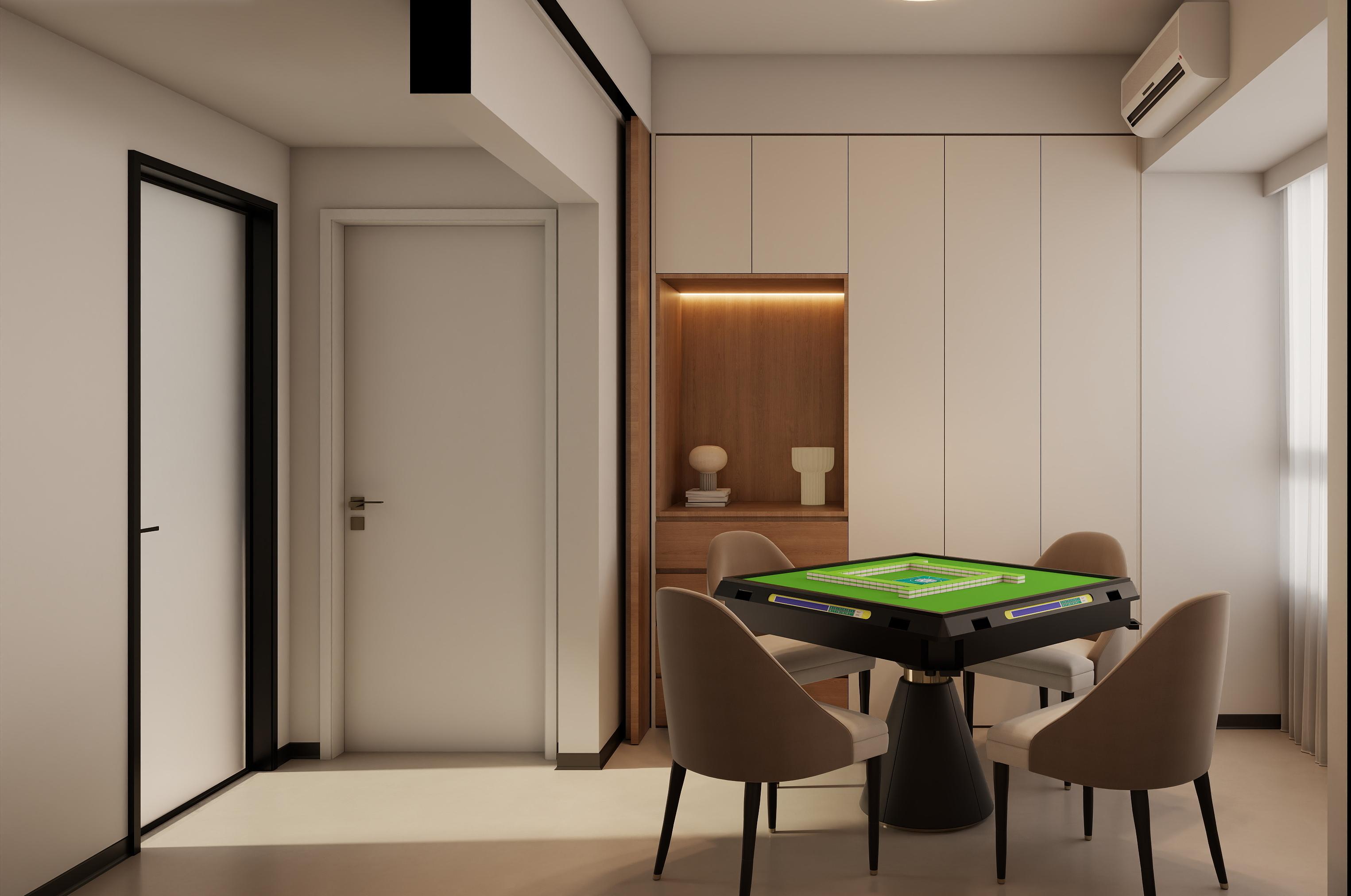 棋牌室:延续全屋现代简约奶油风,以奶白色通顶无拉手柜体为主体,搭配木色开放格与嵌入式氛围灯,线条利落干净。暖咖色休闲椅 + 极简麻将桌,既保证了休闲功能,又通过柔和配色弱化空间的娱乐感,让整个区域温馨不突兀,完美融入整体家装。