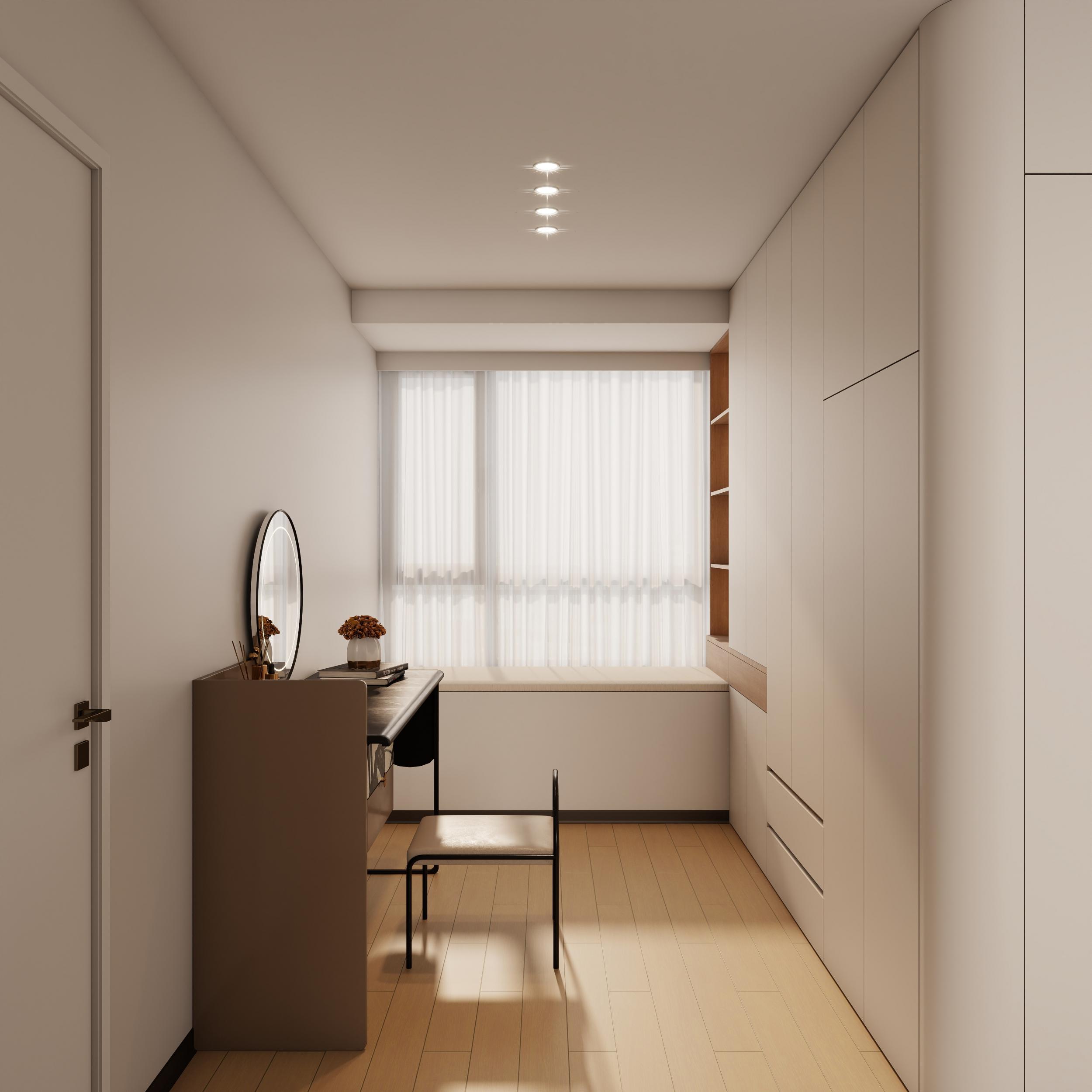 衣帽间:现代极简奶油风,通顶无拉手衣柜 + 悬浮式梳妆台,最大化利用空间。原木飘窗 + 筒灯照明,让小空间通透不压抑,镜面设计延伸视觉,功能与美观统一,满足收纳与梳妆需求,风格与全屋高度统一。