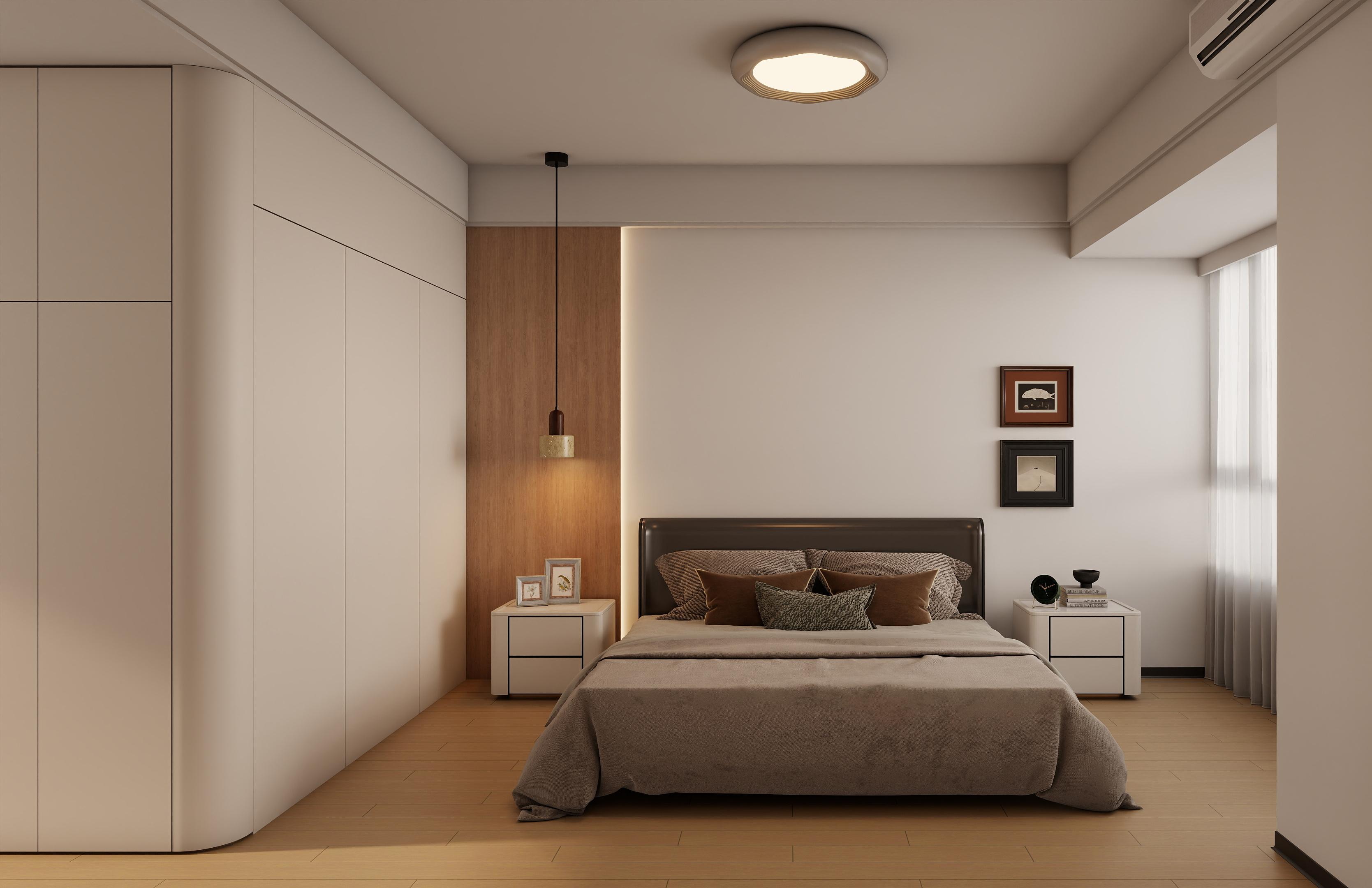 主卧:现代简约奶油风,奶白色通顶弧形衣柜 + 木色床头背景墙,柔化空间棱角。暖棕色床品搭配悬浮吊灯与床头氛围灯,营造治愈的睡眠氛围。原木地板 + 极简床头柜,储物与颜值兼顾,整体温馨松弛,打造舒适的私人休息空间。