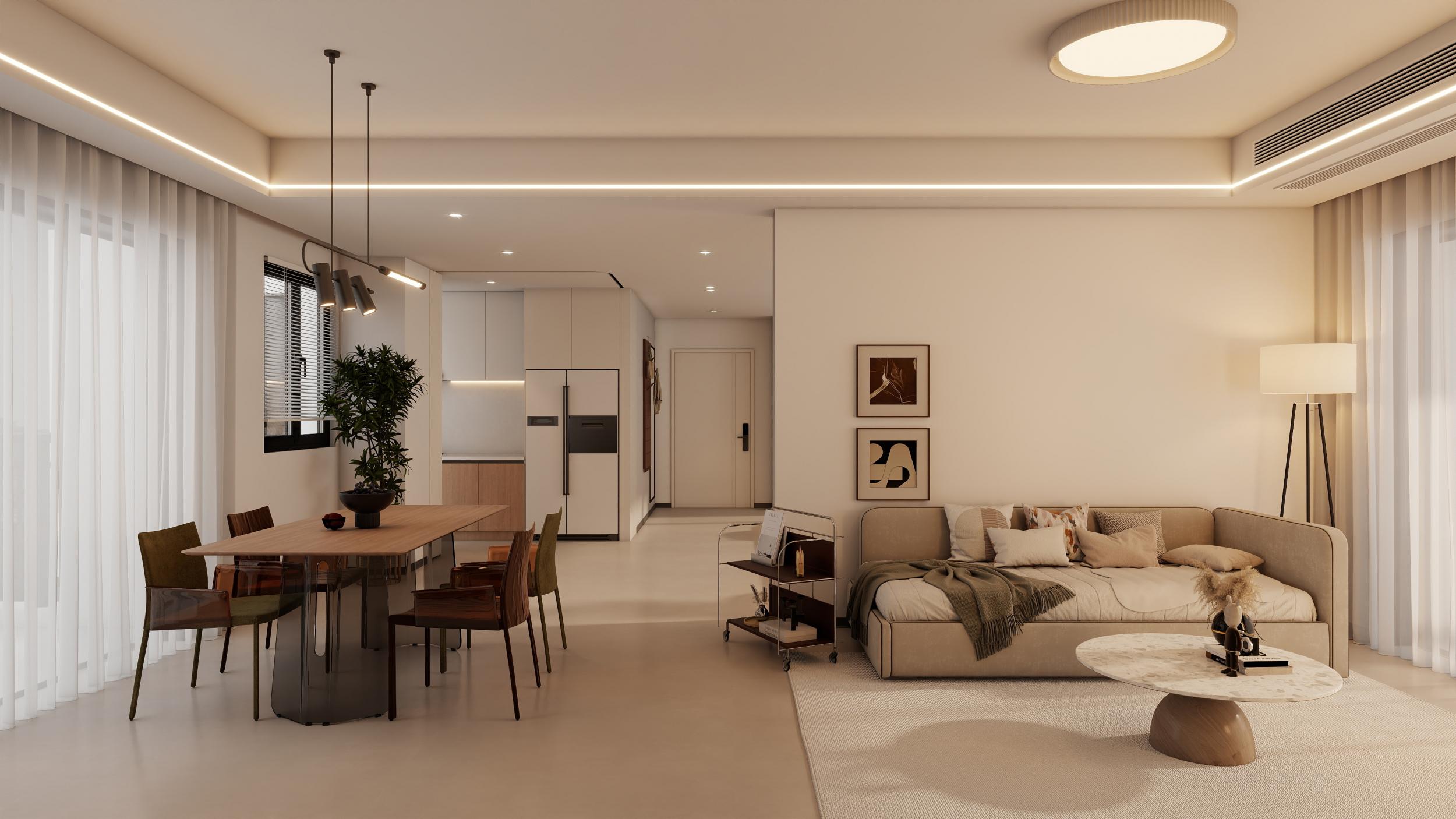 客餐厅:核心为现代简约奶油风,低饱和暖调贯穿全屋。无主灯 + 线性灯设计打造层次照明,大面白纱落地窗最大化引入自然光,空间通透开阔。奶油色沙发床 + 原木餐桌,搭配艺术装饰画,客餐一体的布局让动线流畅,整体氛围温馨松弛,兼具颜值与实用性。