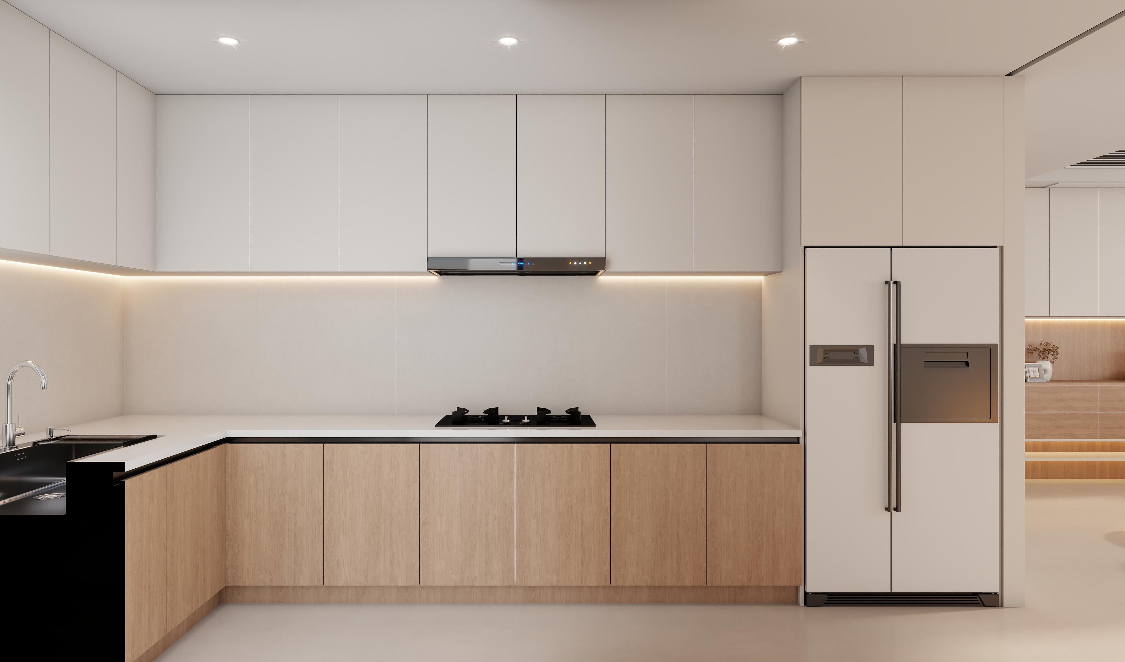 厨房:现代极简奶油风,采用奶白吊柜 + 原木地柜的经典撞色,无拉手柜体 + 线性氛围灯,视觉上整洁清爽。L 型布局最大化利用空间,嵌入式家电让台面更整洁,玻璃隔断(部分方案)兼顾采光与油烟隔离,延续全屋配色,高级感拉满。