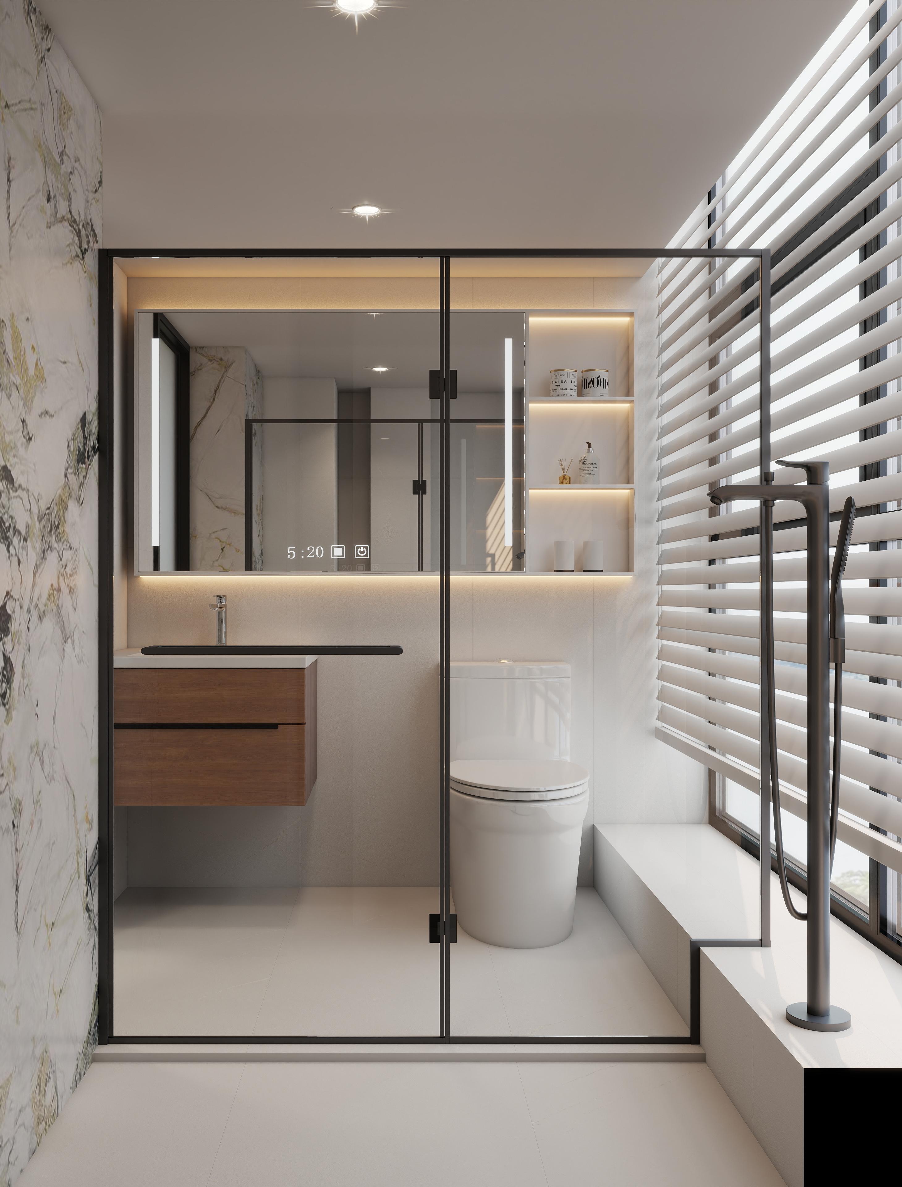 卫生间:以奶白为基底,搭配岩板墙与木色悬浮浴室柜,黑框玻璃隔断干湿分离,镜柜 + 嵌入式壁龛 + 线性氛围灯,兼顾颜值与收纳,整体干净通透,高级感拉满。