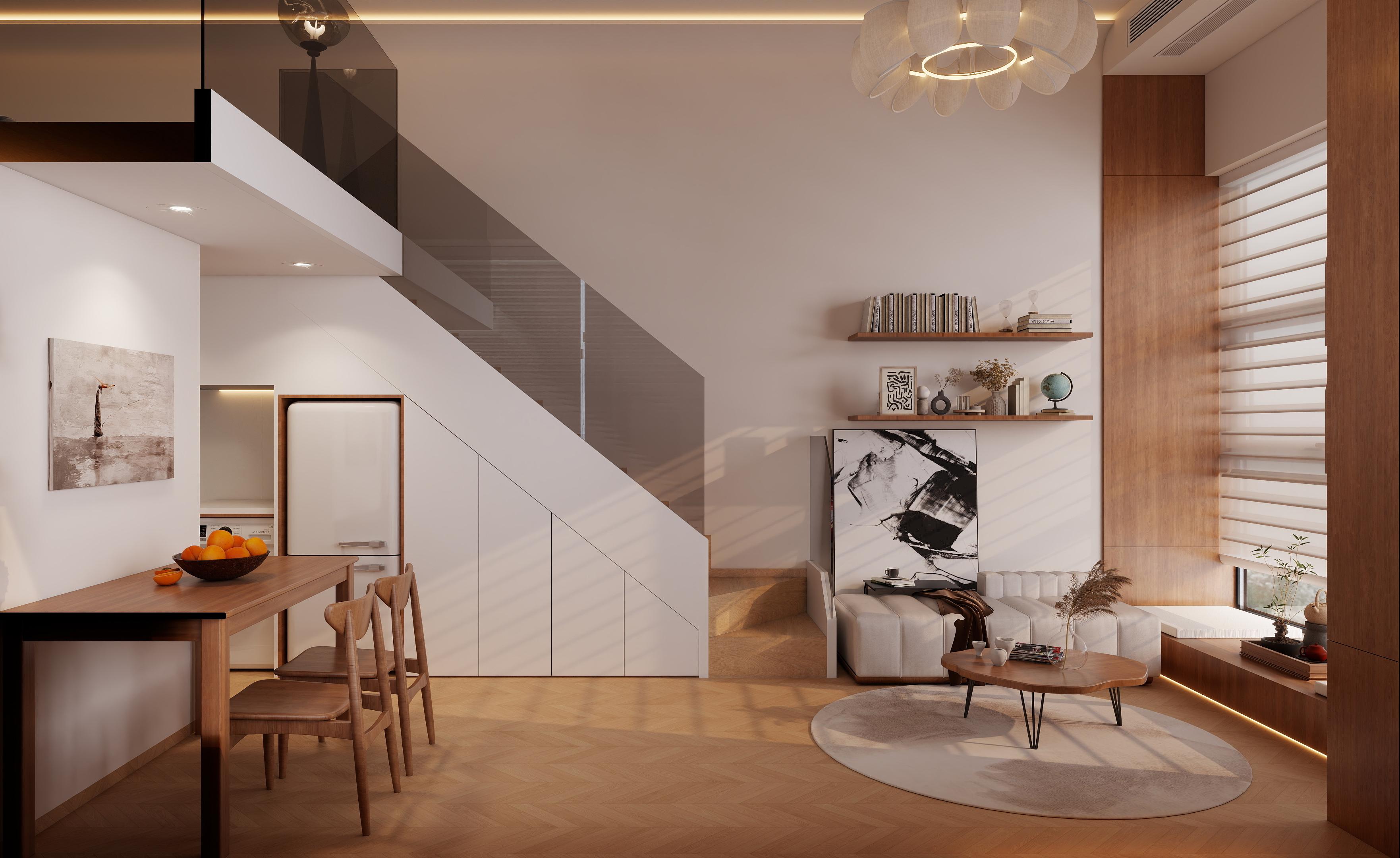 餐厅 / 楼梯区:原木餐桌椅 + 悬浮餐边柜,玻璃扶手楼梯最大化采光,楼梯下做通顶储物柜,木色与白墙呼应,空间通透开阔,动线流畅,兼顾储物与美观。