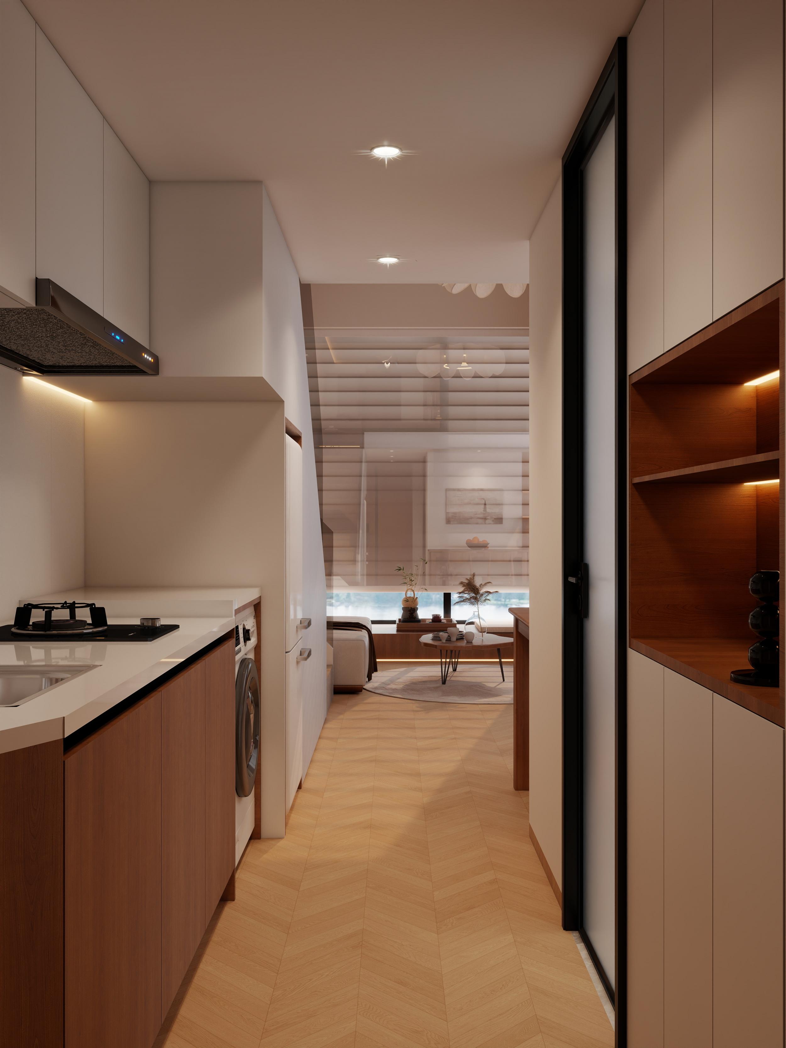 厨房:奶白吊柜 + 原木地柜撞色,无拉手柜体 + 线性氛围灯,嵌入式家电 + 洗烘一体设计,L 型布局实用整洁,延续全屋木色基调,清爽又温馨。