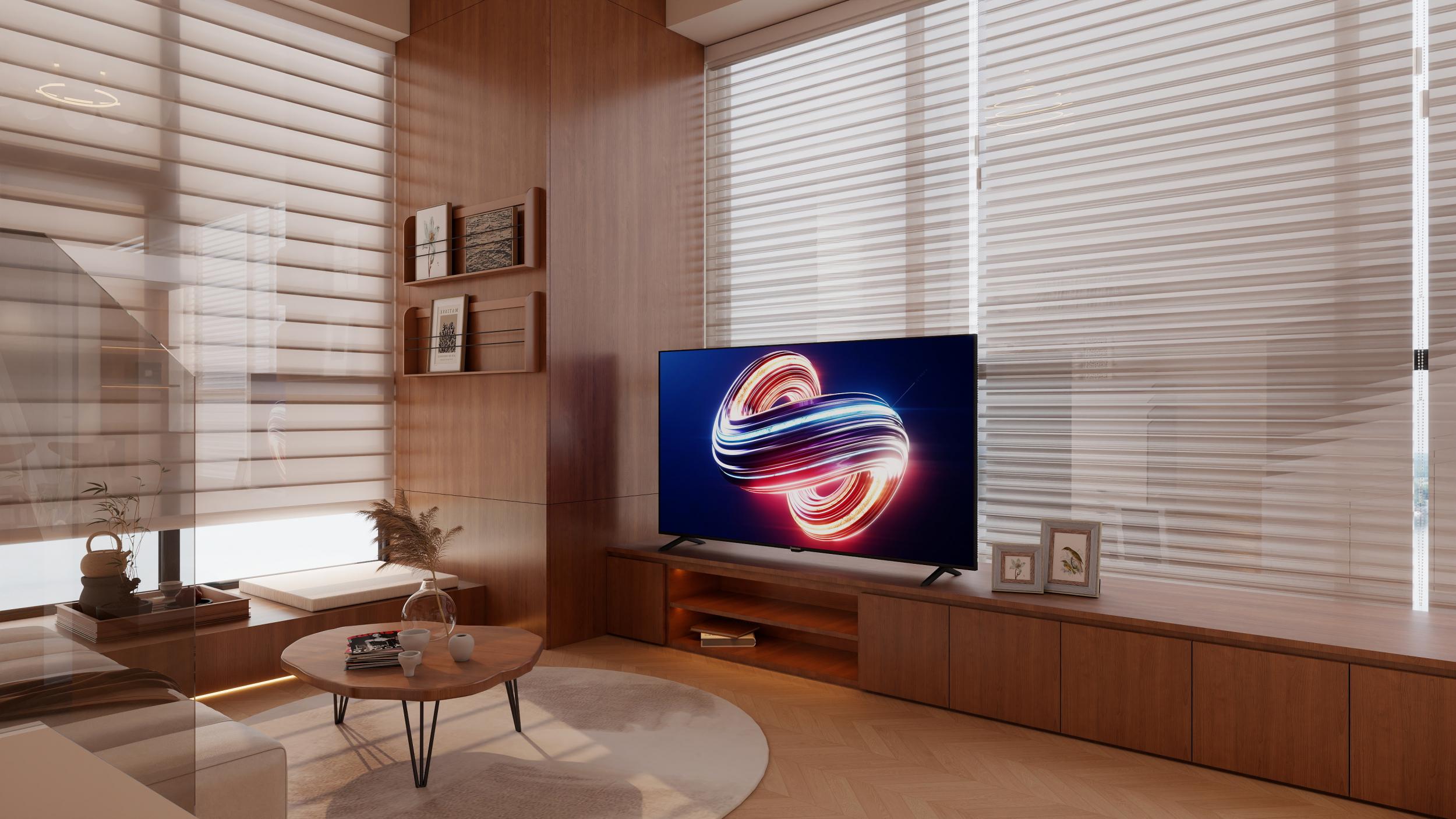 客厅:整墙胡桃木电视柜 + 人字形实木地板,搭配百叶窗柔化光线,弧形原木茶几 + 奶油色沙发,无主灯 + 线性氛围灯,营造温润松弛的氛围,木色贯穿空间,温馨又高级。