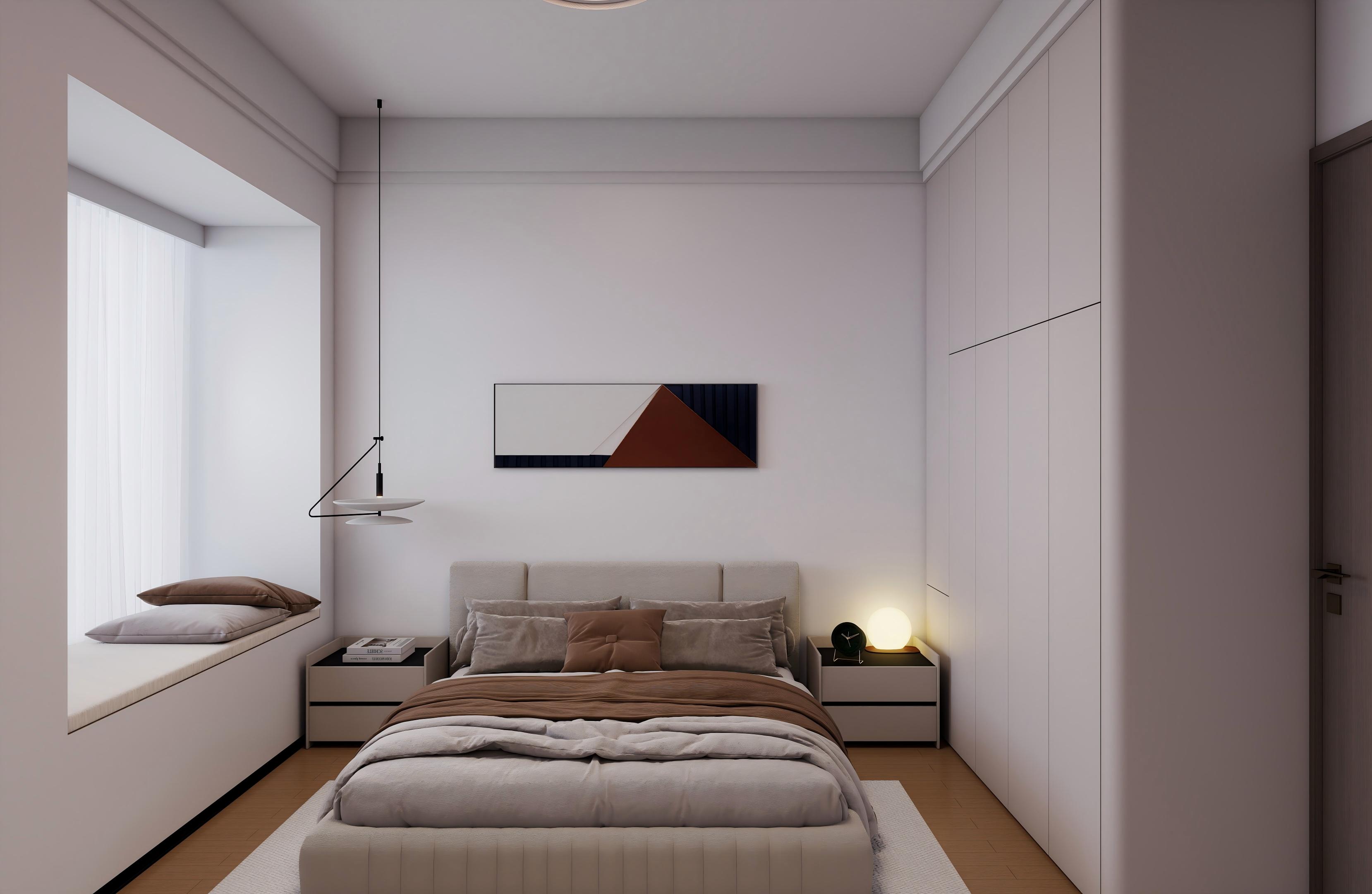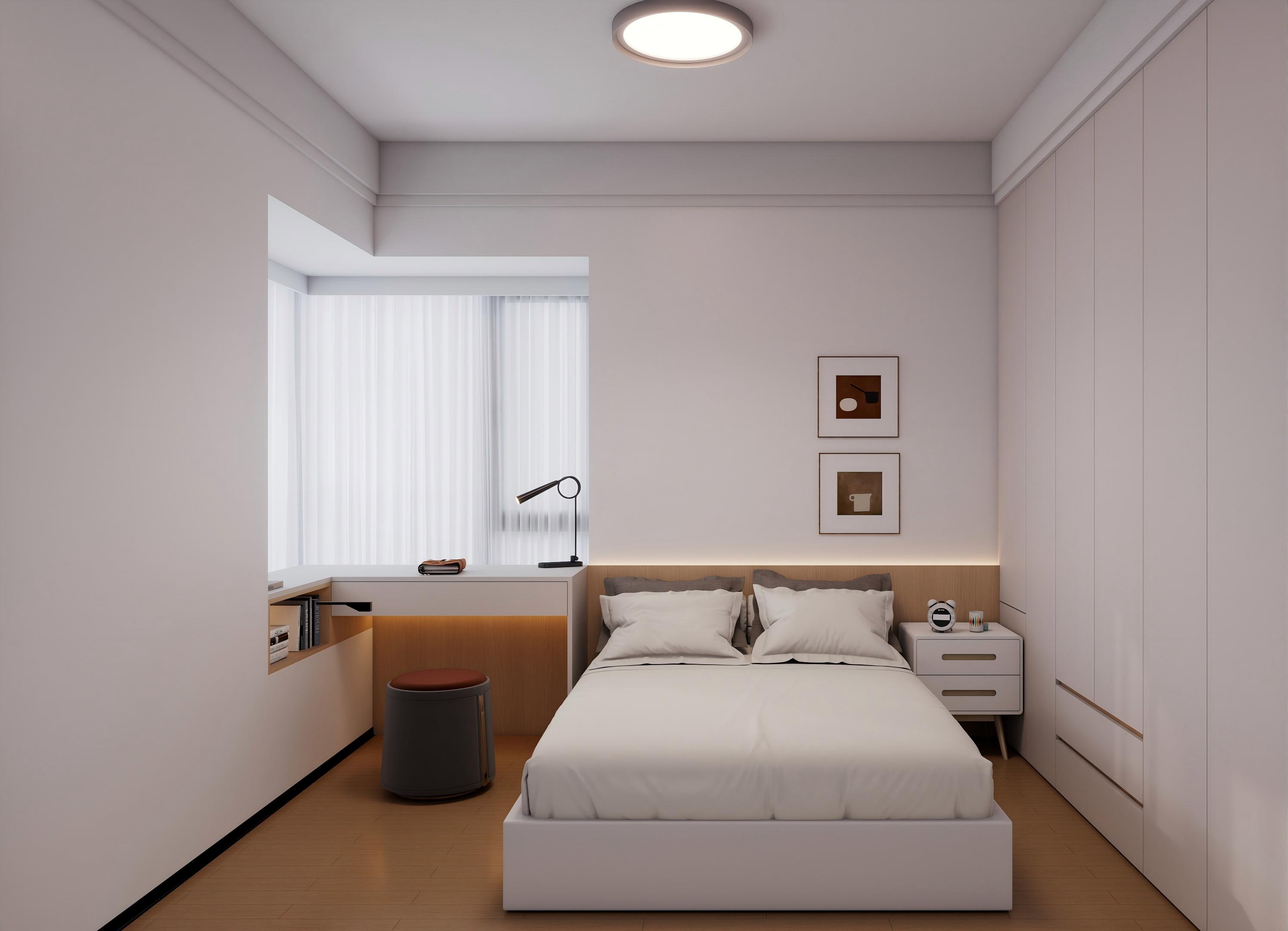 卧室:奶白通顶衣柜 + 悬浮书桌,暖棕床品 + 氛围灯,极简床头柜 + 艺术挂画,原木地板,打造治愈睡眠空间,储物与颜值兼顾。