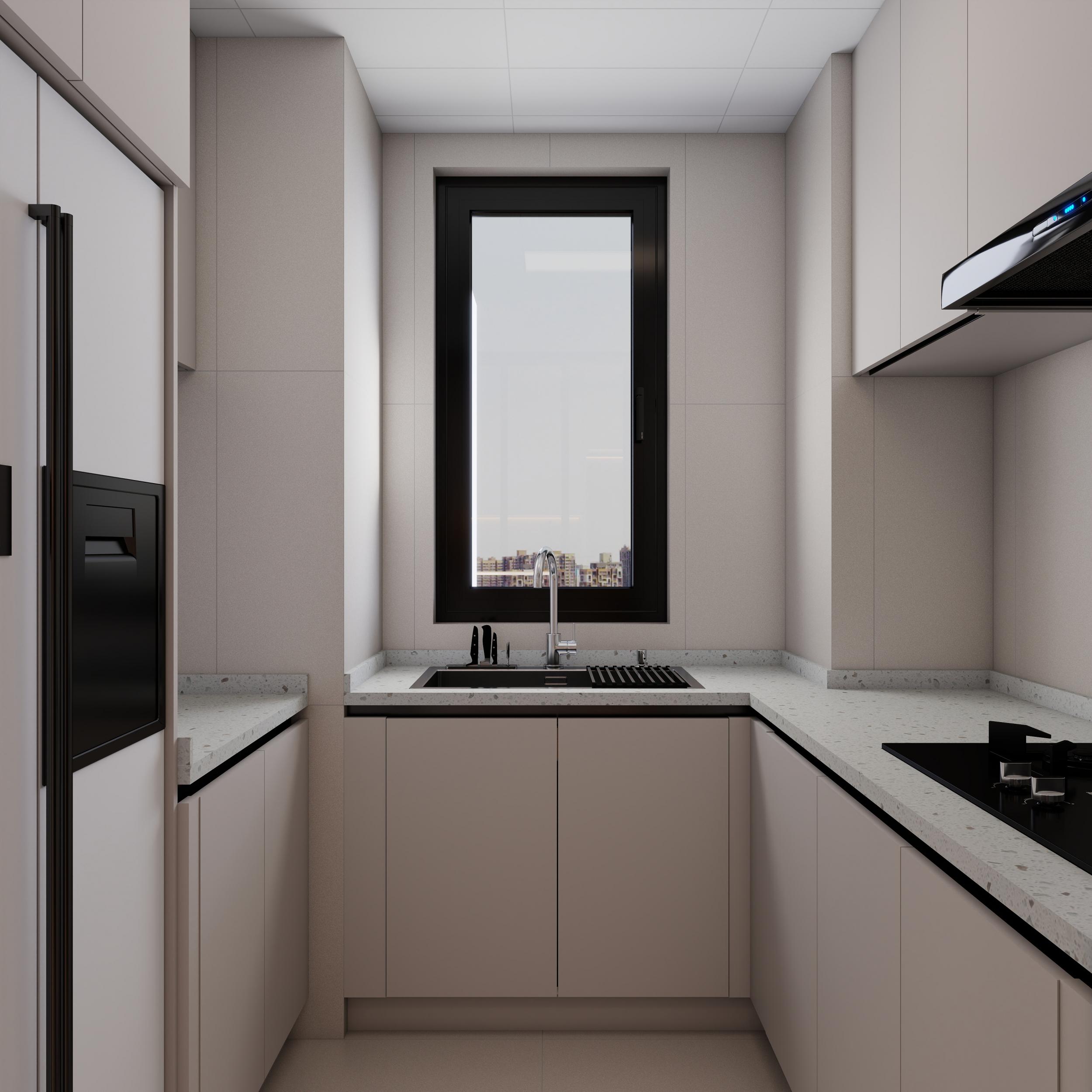 厨房:奶咖色无拉手柜体 + 水磨石台面,黑白撞色五金,L 型布局实用整洁,线条利落,延续全屋暖调,清爽高级。