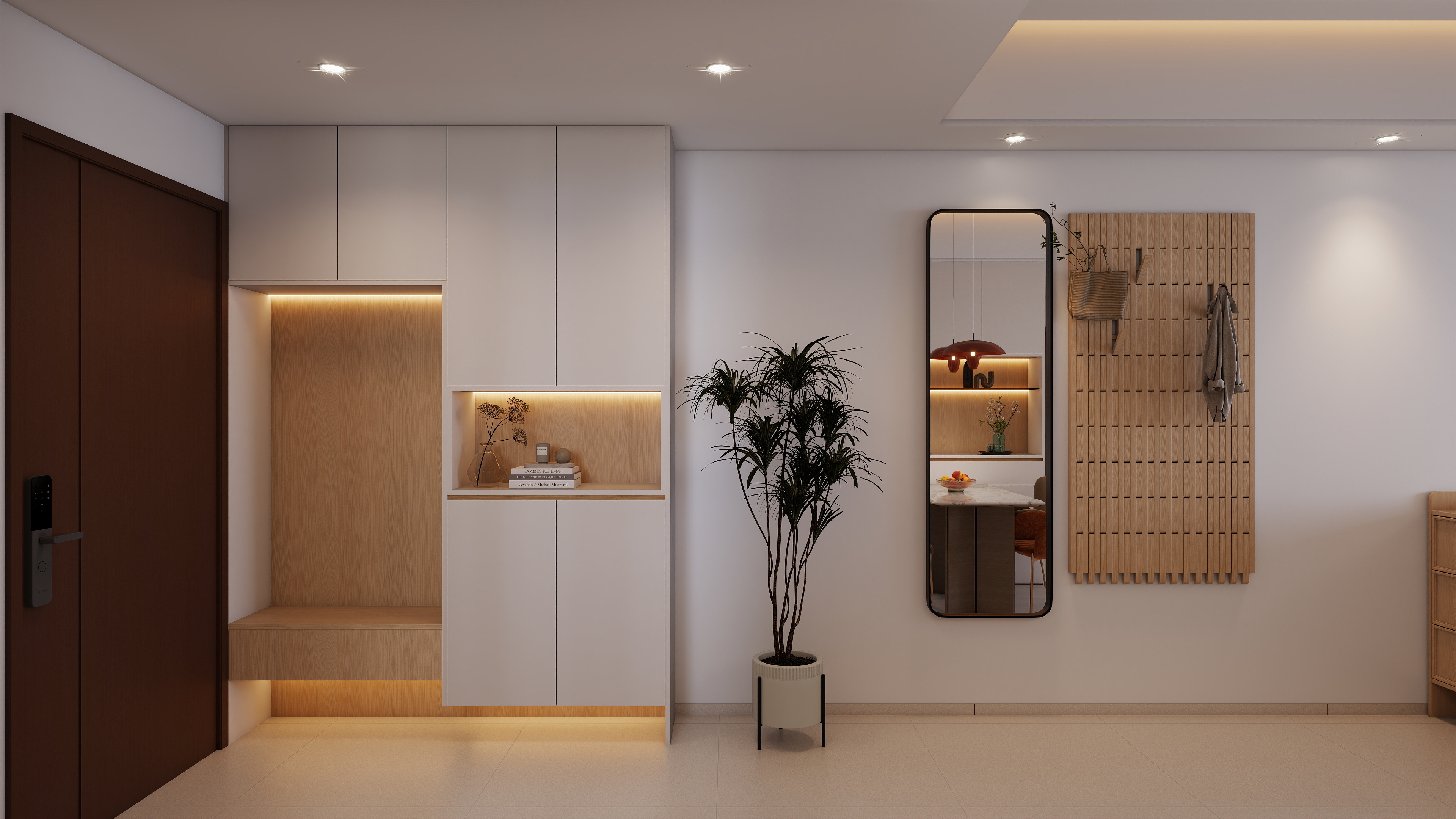 玄关:奶白通顶鞋柜 + 木色开放格,搭配线性氛围灯,原木洞洞板 + 全身镜,入户整洁通透,兼顾收纳与颜值,风格统一。