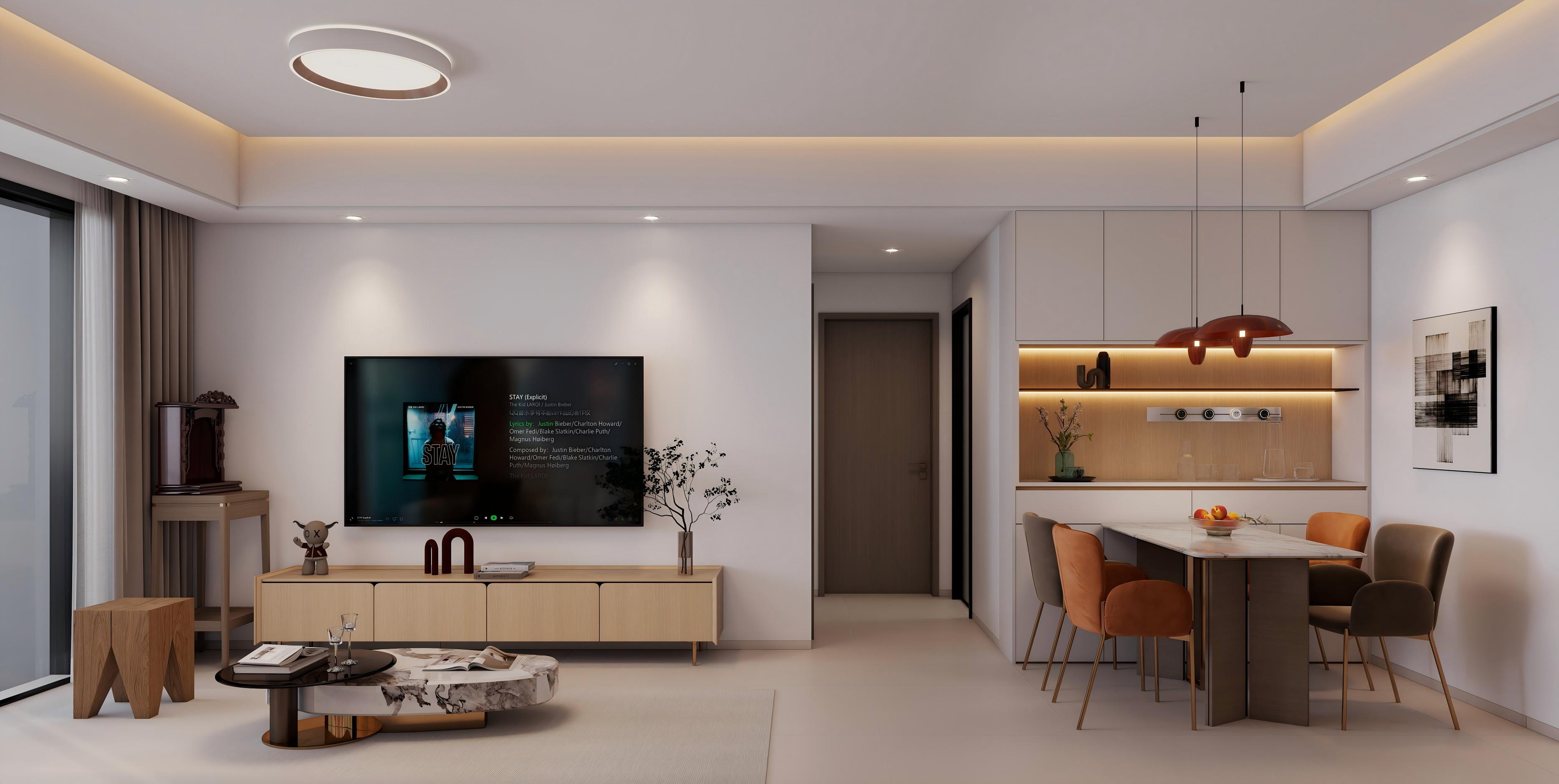 客餐厅:现代简约风,无主灯 + 线性灯设计,原木藤编餐边柜 + 红棕色复古吊灯,大理石餐桌 + 暖调餐椅,奶油风沙发 + 原木电视柜,客餐一体,温馨松弛,复古感拉满。