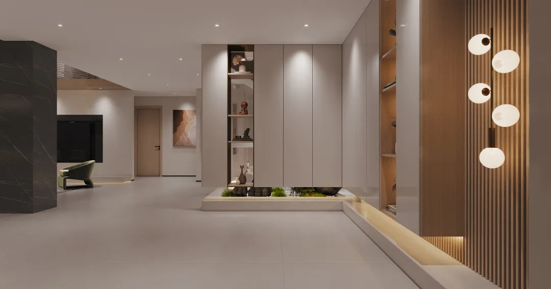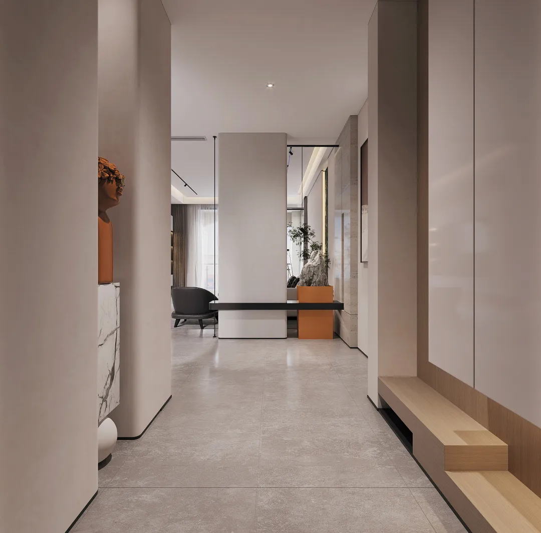 从大门进来,入户处简单大方的线条奠定房子自然且舒适的设计基调,靠墙摆放的雕塑,为角落空间增添一丝艺术氛围,整体而言就是简约典雅。