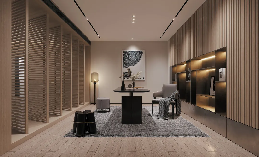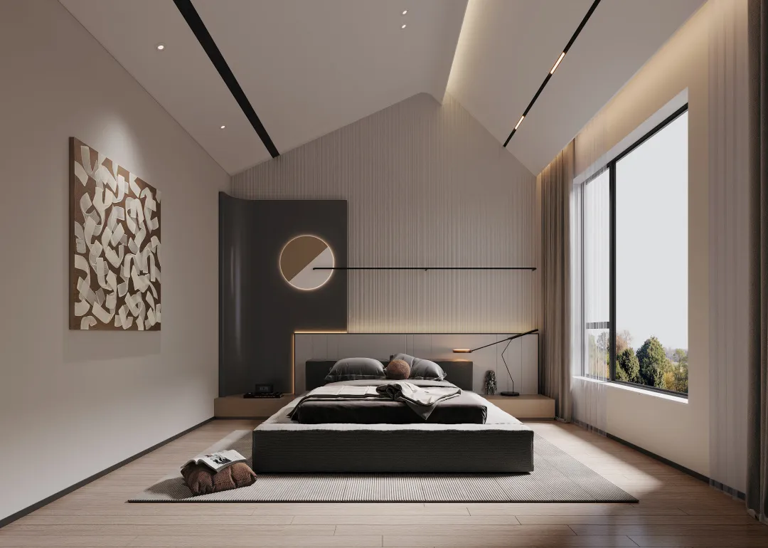 3楼一整层都主人房,兼具主卧+起居室+卫生间+衣帽间+SPA 五大空间,质朴沉稳的家居风、原木色和灰黑色搭配、呈现当代极简主义最朴质的奢华本质。