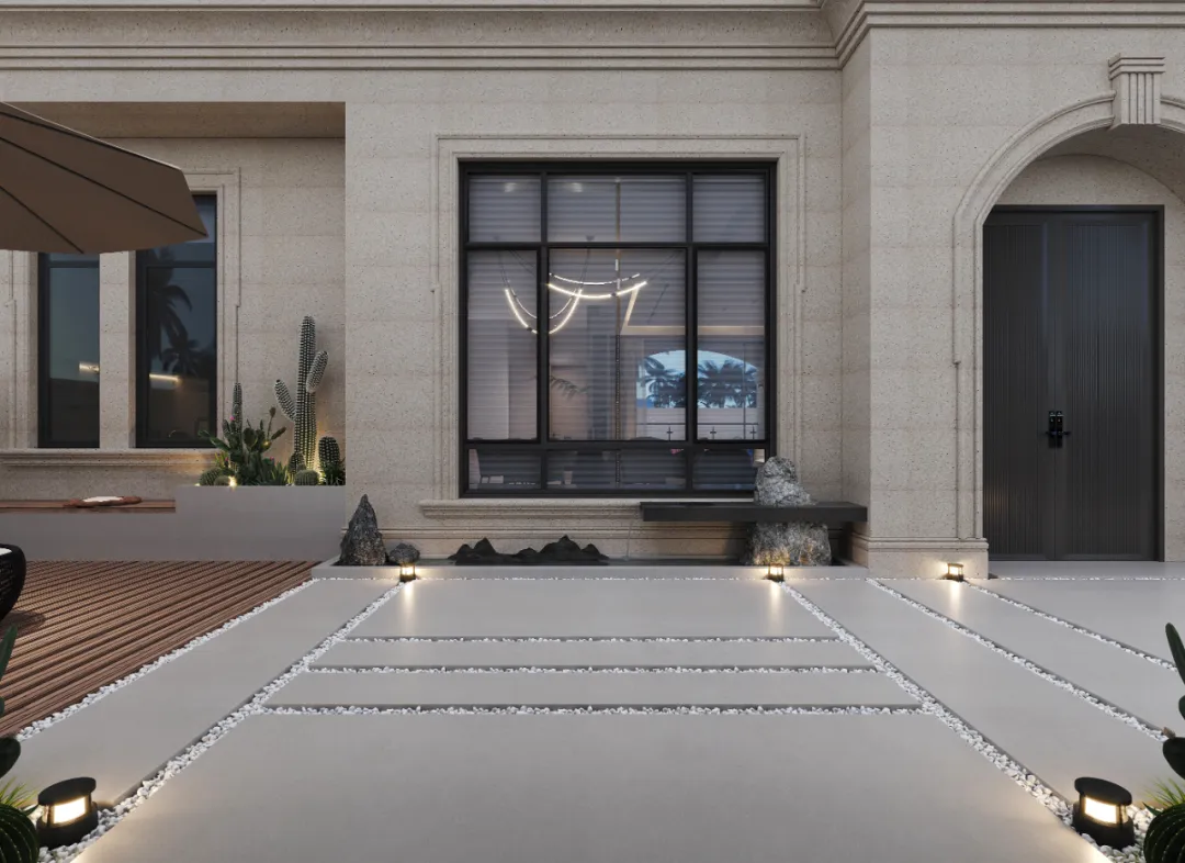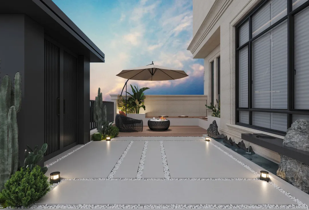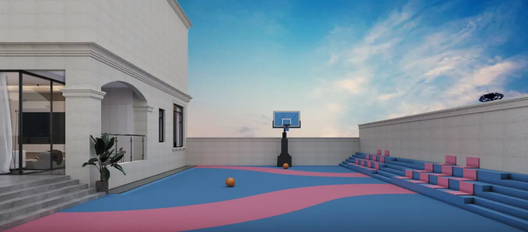 花园用灰麻石英石、白砂砾铺道,一旁搭建休闲区,后花园则铺上塑胶,改建成篮球场,往后这里就是孩子们打篮球、户外活动的主要区域。