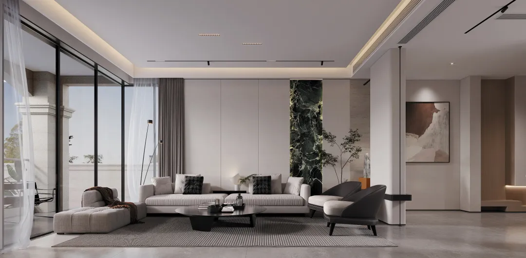 客厅不做传统的电视墙,定制收纳柜,内嵌电视,释放更多空间,让客厅看起来通透、时尚大方。