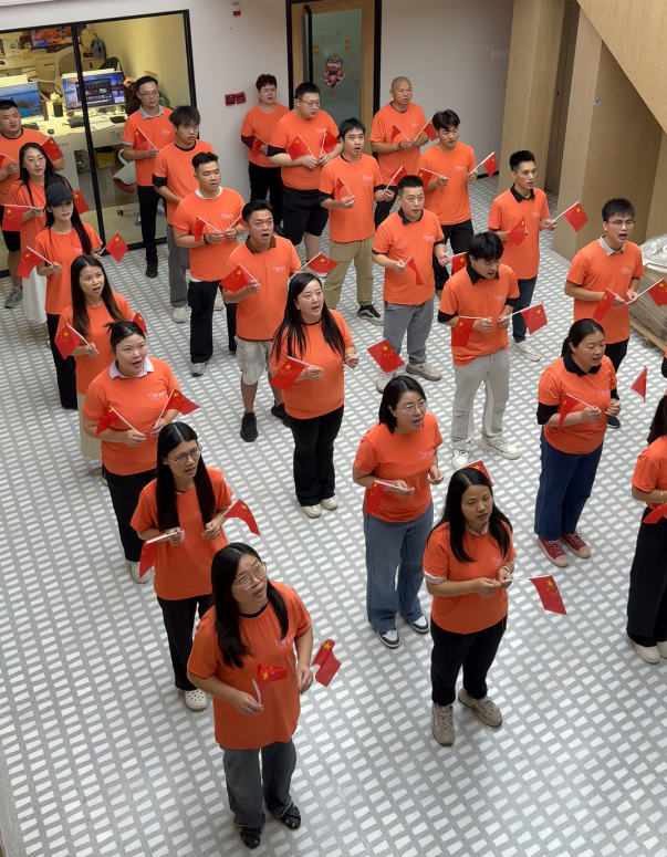十一当日,非意装饰全体员工身着统一的橙色工作服,每个人手中都挥舞着鲜艳的五星红旗映照出大家心中的爱国情怀,随着激昂的旋律响起,《歌唱祖国》的熟悉音符在空气中回荡。全体员工齐声高歌,歌声嘹亮而整齐,将中华儿女对祖国的深情与赞美传递,大家用歌声表达着对祖国繁荣昌盛的自豪,对民族复兴的坚定信念,在这一刻,每个人的心都与祖国紧紧相连,共同跳动。
