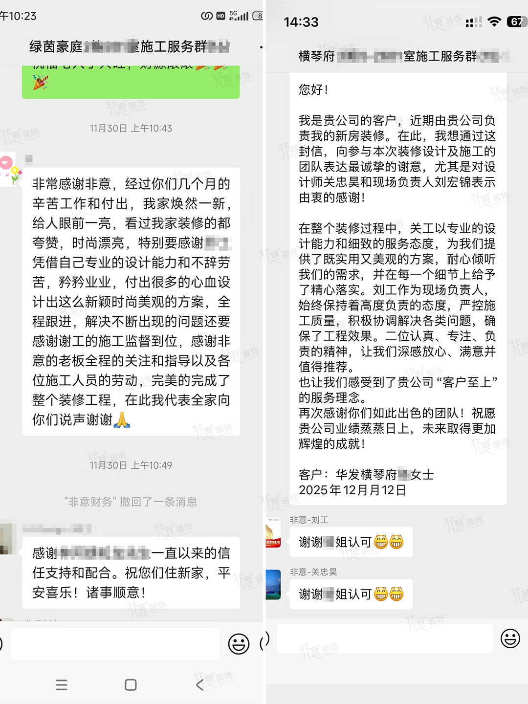 非意装饰更清楚地了解到业主在装修时最在意的,是报价清不清楚、施工规不规范、后期有没有保障,主动接受公众监督,认真听取业主的真实反馈,诚信经营才能落到实处。