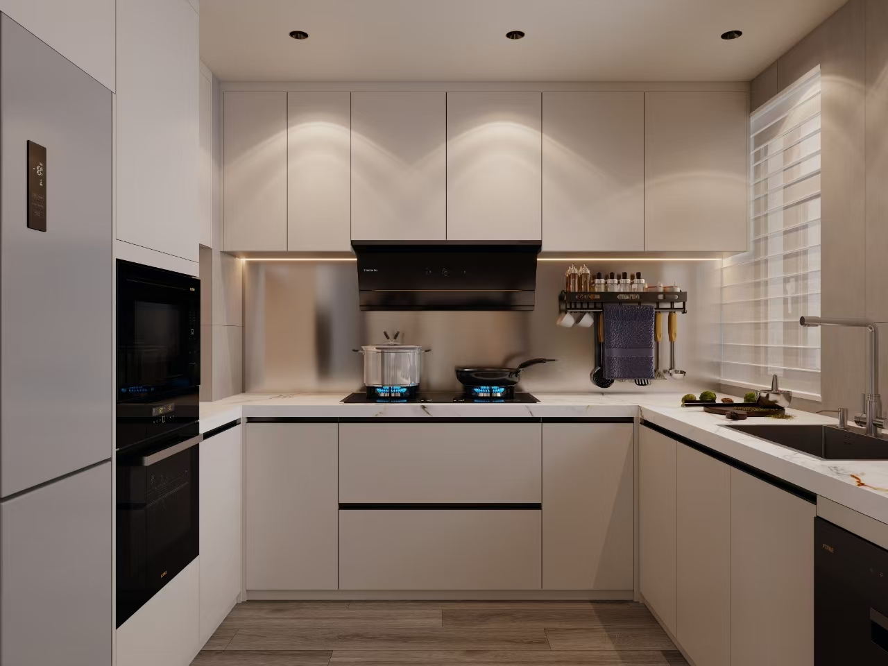 功能分区上,厨房建议采用“U型”或“L型”布局,最大化利用空间,同时预留冰箱、洗碗机等家电位置,适配现代厨房需求;卫生间需做好干湿分离,避免潮湿滋生细菌,可采用玻璃淋浴隔断,搭配防滑地砖,保障老人与小孩的安全。储物空间设计也是重点,回迁房居民往往有较多生活用品需要收纳,可在玄关设置鞋柜与换鞋凳,客厅设计隐形储物柜,卧室打造定制衣柜,充分利用墙面、转角等闲置空间,提升空间利用率。